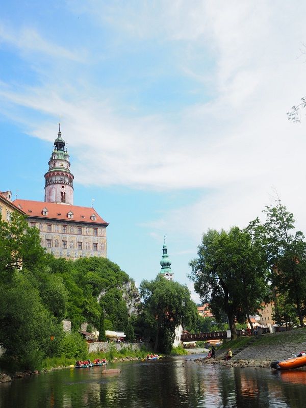 เรือล่องไปเรื่อย ๆ จนครบ 1 ชั่วโมง เรือไม่ได้กลับไปส่งที่เดิม จอดเลยปราสาทเชสกี้ครุมลอฟ (Český Krumlov Castle) ไปแล้ว พวกเราต้องเดินข้ามสะพานไปขึ้นถนนอีกฝั่ง แล้วเดินวนกลับเข้ามาก็จะผ่านร้านจองเรืออีกครั้ง เดินเหนื่อยกันพอประมาณเลย