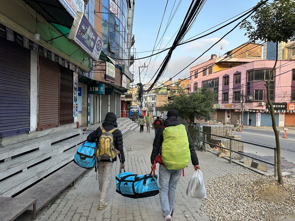ตื่นเช้ามาพร้อมกับการรีบกินอาหารเช้าเพราะตารางการเดินทางวันนี้เริ่มต้นประมาณ 7.00 น. เราได้รับการแนะนำให้รู้จักไกด์และลูกหาบที่จะพาเราเดินทางตลอด 8 วันบนภูเขา ไกด์ชื่อคุณซันโตส ส่วนลูกหาบชื่อคุณนาบิน (เหมือนคุณนาบินที่เป็นผู้ที่เราติดต่อด้วยตลอดก่อนเดินทางมาที่เนปาล)