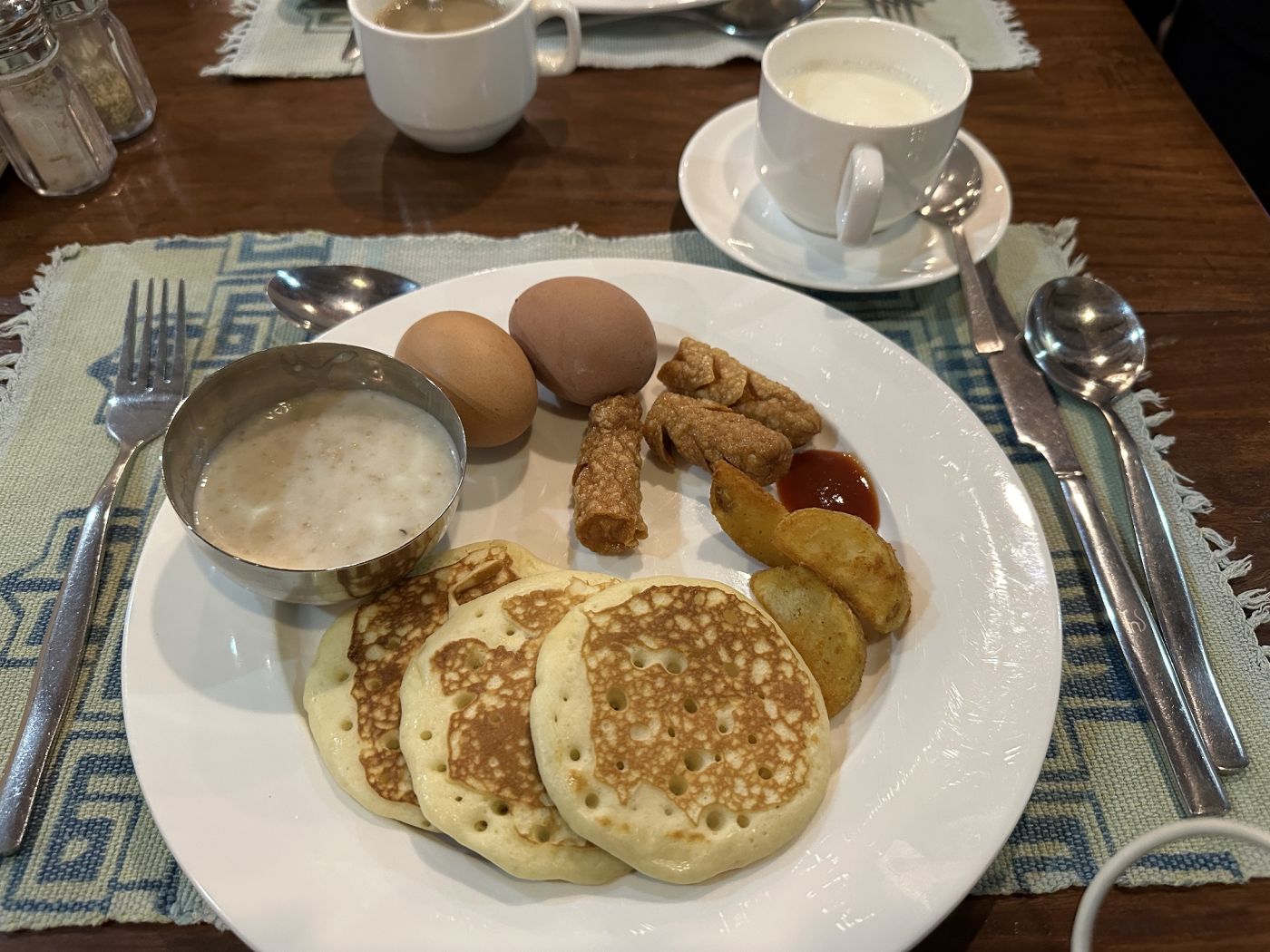 หน้าตาอาหารเช้าที่โรงแรมจะประมาณนี้ แพนเค้ก, ไส้กรอก, มันฝรั่งทอด, ไข่ต้ม/ดาว, ข้าวโอ๊ต