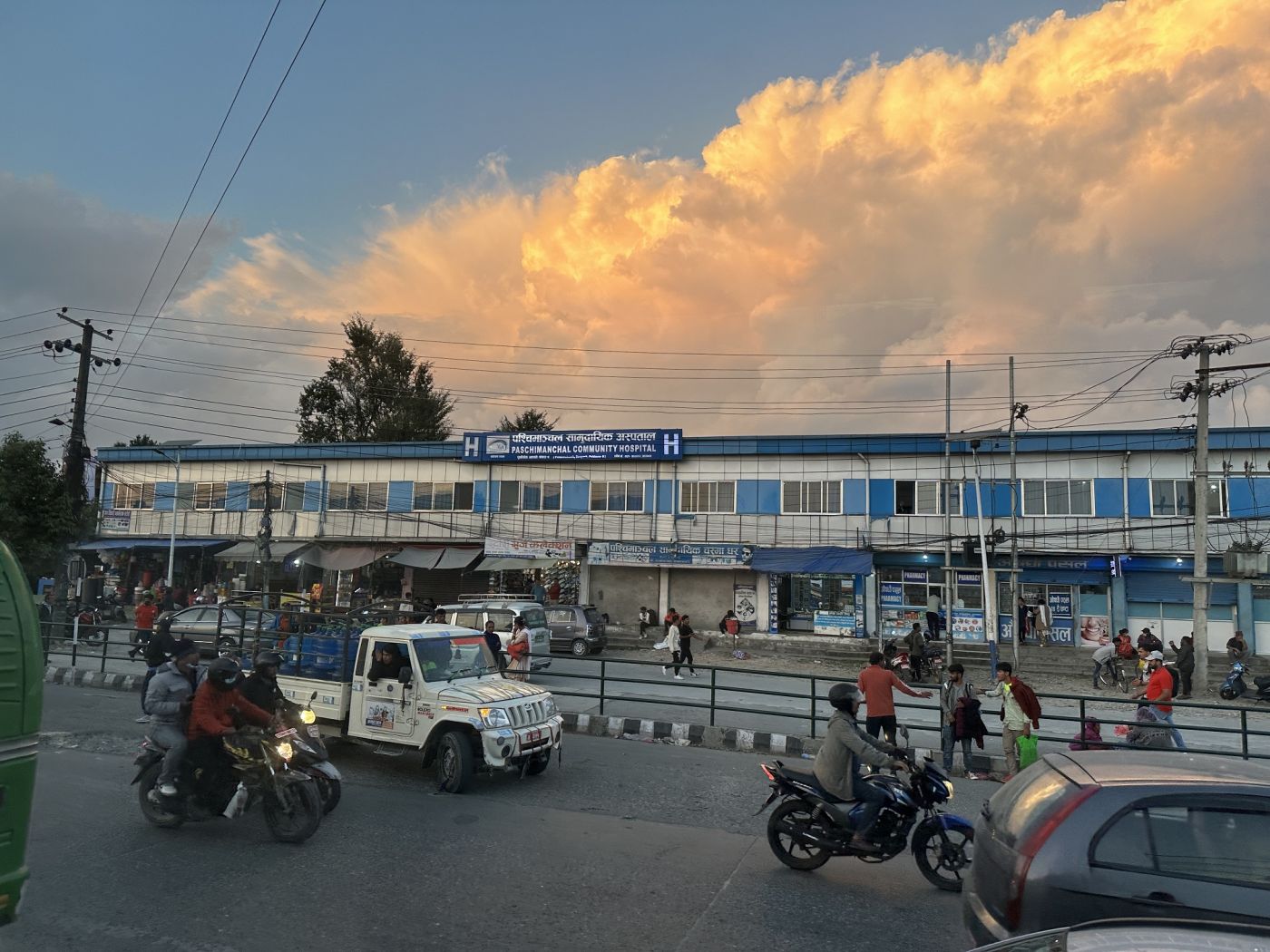 ส่วนนี่คือโรงพยาบาล จะเห็นว่าร้านค้าปิดเยอะเนื่องจากเทศกาล Dashain เป็นเทศกาลใหญ่ที่สุดของปีของเนปาลที่คนกลับบ้านไปเพื่อประกอบพิธีกรรมทางศาสนา ทำให้ร้านรวงต่างๆปิดกันเป็นเวลาหลายวัน เมืองจึงดูเงียบถึงแม้จะเป็นเมืองท่องเที่ยวที่ดังมากก็ตาม