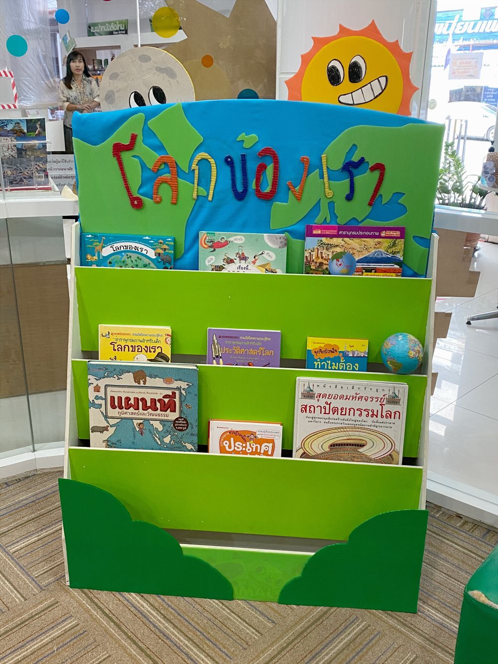 วันที่ 1 พวกเราได้พบว่าจำนวนสมาชิกที่เข้ามาใช้ห้องสมุดมีส่วนเกี่ยวข้องกับวันหวยออกที่คนมักจะอยู่บ้านลุ้นโอกาสรวยกัน พวกเราจึงมีเวลาออกแบบและวางแผนทำแผงหนังสือแนะนำประจำสัปดาห์ และประกอบร่างให้เสร็จภายในวันต่อมา ธีมแรกที่เราเลือกก็คือ หนังสือที่เกี่ยวกับ ‘โลกของเรา’