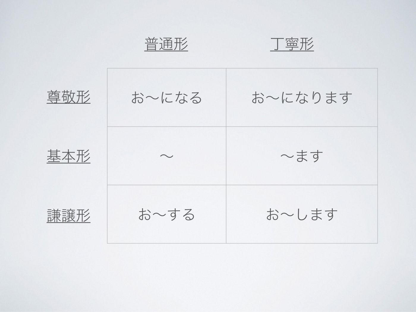 ดังจะเห็นได้จากตารางนี้ว่าคำยกย่องกับถ่อมตนมีการผันอย่างไร ซึ่งส่วนใหญ่แล้วรูปที่เรามักจะใช้กันก็คือ 尊敬形(丁寧形) แล้ว 尊敬形(普通形) ล่ะ ใช้ไม่ได้หรอ หรือใช้ได้ตอนไหนกันแน่ คำตอบก็คือ ใช้ได้ค่ะ แต่ว่าก็ต้องดูสถานการณ์ไป เช่น