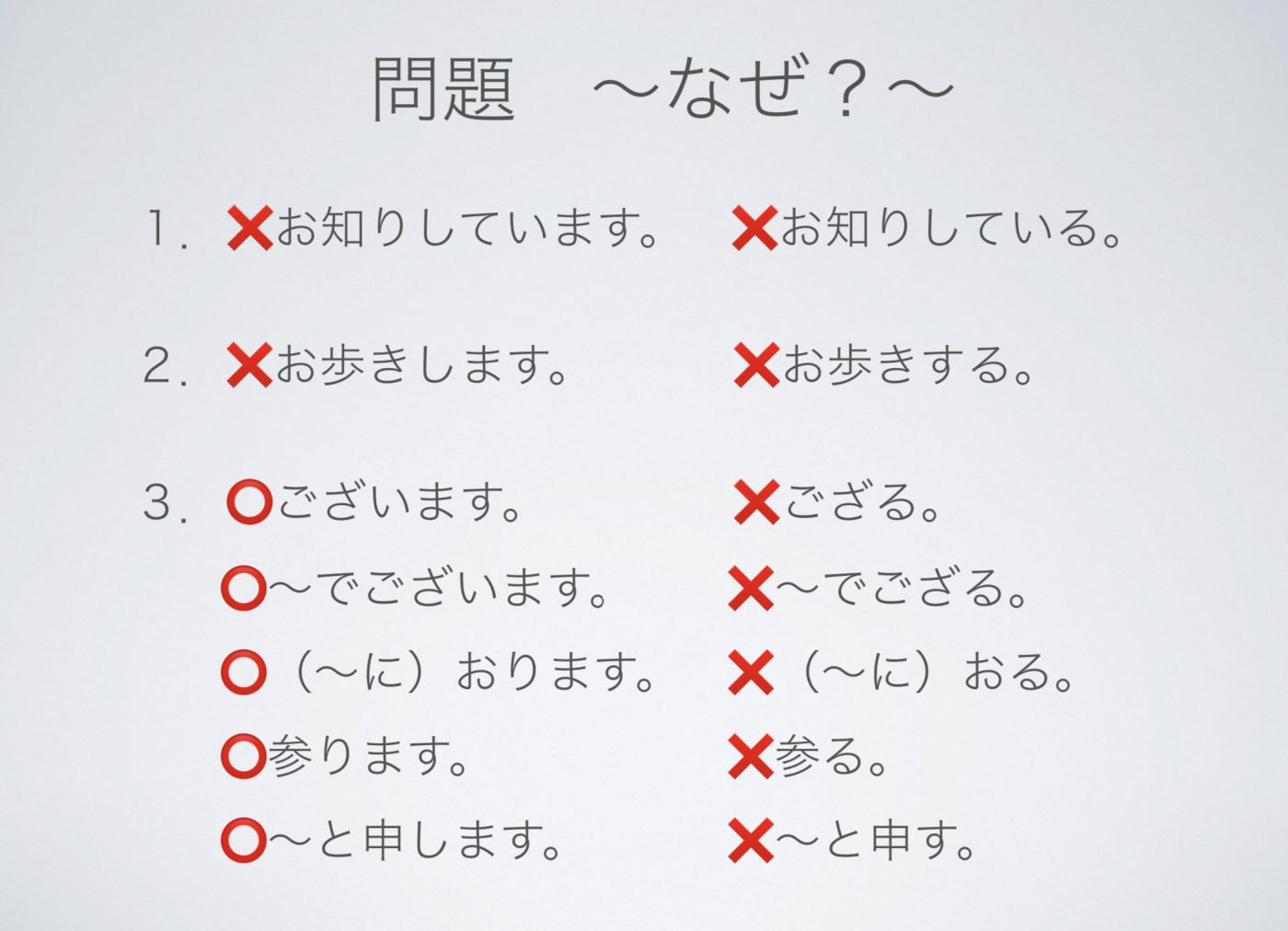 คุณผู้อ่านที่เห็นภาพนี้ก็อาจจะสงสัยว่า ทำไมบางคำ ถึงใช้รูปถ่อมตนไม่ได้ หรือบางคำใช้ได้ได้แค่ 普通形 กันนะ เช่น お歩きします ทำไมถึงใช้ไม่ได้กันล่ะ คำตอบก็คือ ตามที่ได้กล่าวไปข้างบนถึงความหมายของรูปถ่อมตน คือพูดถึงการกระทำของตน *ต่อคู่สนทนา* แต่คำว่า 歩きます ไม่สามารถใช้ได้ เพราะเราสามารถพูดคำนี้ได้โดยไม่ต้องมีคู่สนทนานั่นเอง