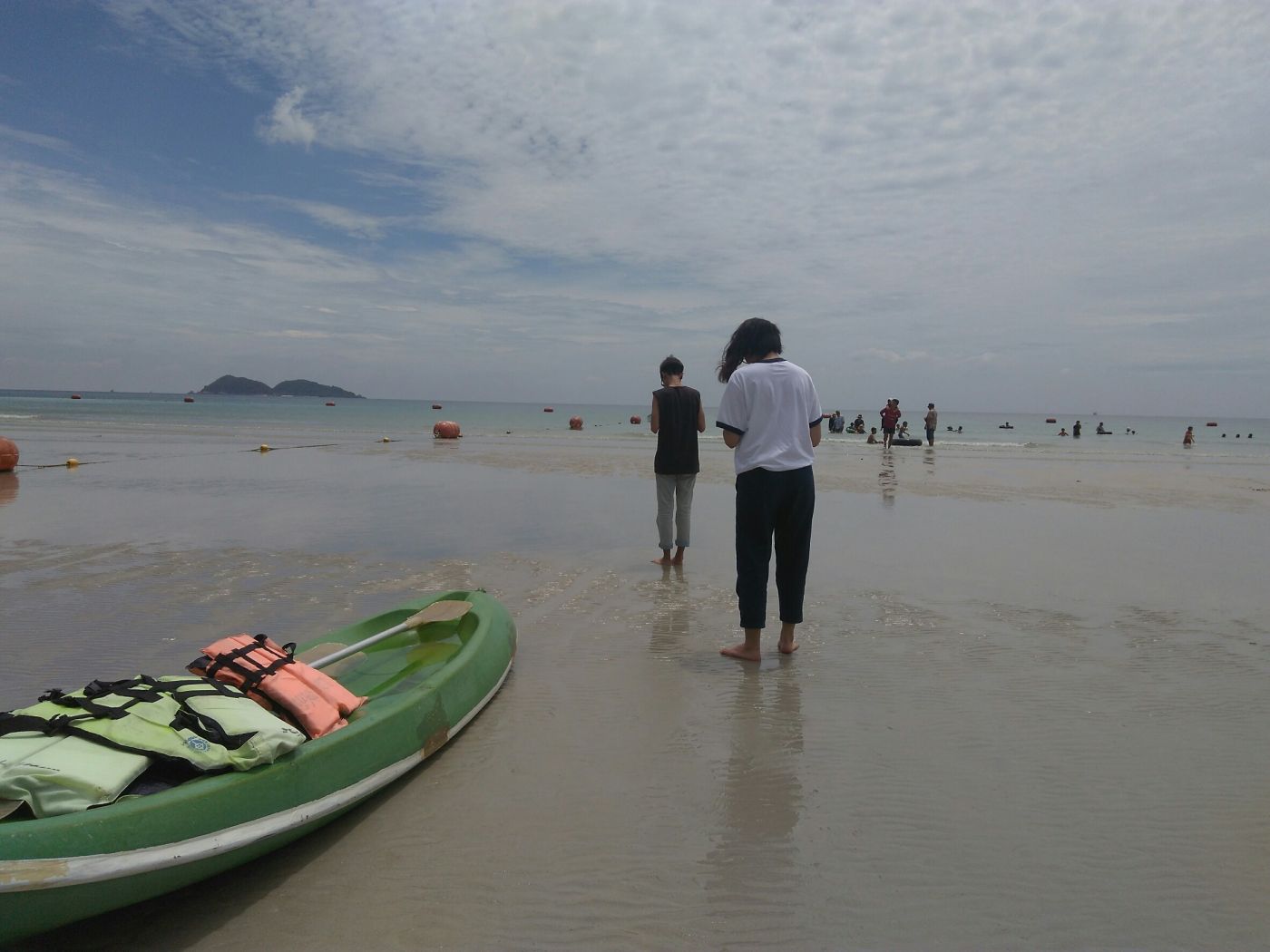 ฝ้ายเองก็จัดแจงเปลี่ยนชุดเตรียมลงเล่นน้ำเต็มที่ เรากับคุ่นก็ไปยืนเตะๆ น้ำ โดนน้ำซัดขึ้นมาเป็นระยะๆ ส่วนฝ้ายนั่งจ๋อมลงในน้ำเรียบร้อย ไปๆ มาๆ เหมือนจะเปียกกันถ้วนหน้า