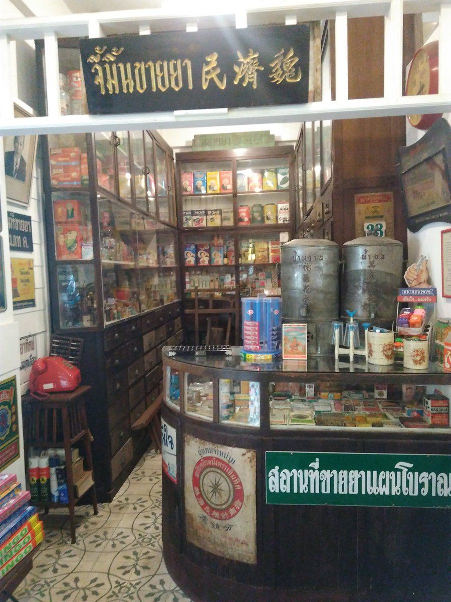 ถัดเข้าไปที่ด้านในตัวบ้าน ก็จะเป็นร้านขายยา ที่มีกล่องปลาสเตอร์ยาเทนโซพลาสแบบเก่ายันแบบปัจจุบัน แพคเกตจิ้งของยาอม ยาแก้ไอต่างๆ อย่างของฮอลล์ แฮ็คส์ มายบาซิน เป็นต้น