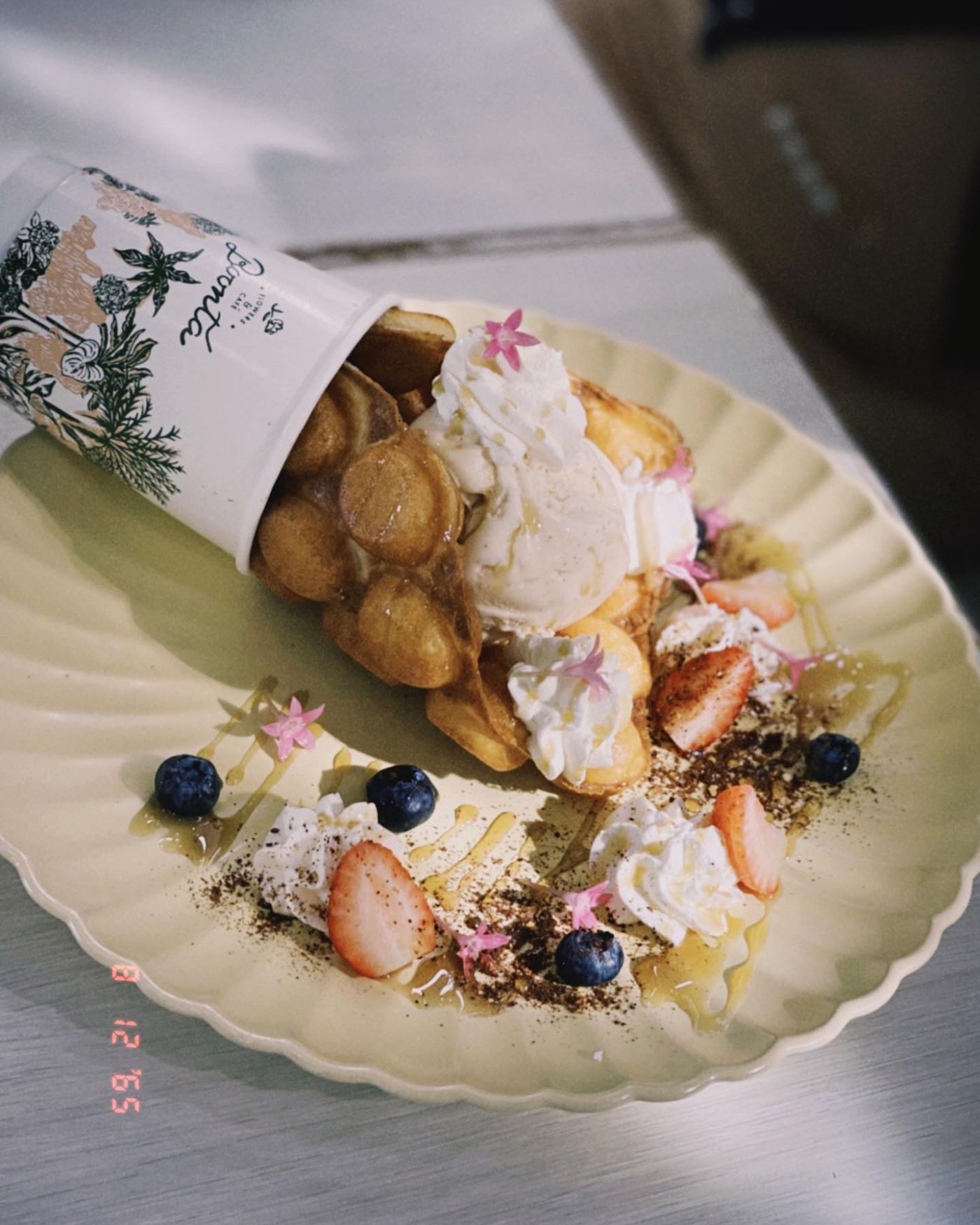 สิ่งที่หน้าตาเหมือนวาฟเฟิลฮ่องกงคว่ำ (เขาจัดจานมาแบบนี้!) คือ บุญตาการ์เด้น ดูเหมือนจะเป็นจานซิกเนเจอร์ของร้าน เป็นวาฟเฟิลฮ่องกงท็อปด้วยไอศกรีมโฮมเมดรสวานิลลา เสิร์ฟพร้อมผลไม้ต่าง ๆ ให้รสเปรี้ยวตัดความหวานของแป้งและไอศกรีม ราดด้วยน้ำผึ้ง เป็นจานที่อร่อยมาก แป้งวาฟเฟิลดีมากกกก กรอบนอกนุ่มในสุด ๆ กินกับไอศกรีมวานิลลาแล้วก็หยุดไม่ได้ แต่ก็นั่นแหละ แม่สั่งมากินคำเดียวแล้วที่เหลือให้เราช่วยกิน ก็คือกลิ้งออกจากร้าน อิ่มจนอีกนิดอาจจะตายอยู่ในร้านเพราะท้องแตก