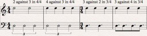 การใช้จังหวะ Polyrhythm หรือการทับซ้อนของจังหวะหลายแบบไปพร้อมกัน เป็นรูปแบบจังหวะที่นิยมใช้กันในดนตรีแจ๊ส โดยเฉพาะในนักเล่นกลองที่ในหลายครั้งจะต้องแยกประสาทระหว่างมือและเท้าที่เล่นจังหวะคนละรูปแบบกัน จากในภาพจะเห็นได้ว่าบรรทัดบนและบรรทัดล่างในแต่ละห้องมีจำนวนตัวโน้ตไม่เท่ากัน แต่เมื่อคำนวณโดยการนำโน้ตของแต่ละบรรทัดมารวมกันแล้วจะมีค่าเท่ากันทั้งสองบรรทัด