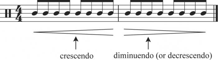 *Crescendo - เสียงดังขึ้น **Diminuendo - เสียงเบาลง ในภาพจะเห็นสัญลักษณ์เป็นขีดด้านล่างโน้ต ยิ่งปลายเปิดกว้างเสียงจะค่อย ๆ ดังขึ้น ปลายแคบลงจนปิดเสียงจะเบาลงเรื่อย ๆ ตอนท้ายของ Bridge มีการเพิ่ม 2 จังหวะอีกครั้งนึง เมื่อนำไปรวมกับรวมก่อนหน้าเป็น 4 จังหวะก็จะมีค่าเท่ากับ 1 *ห้องดนตรีพอดี ครบสมบูรณ์