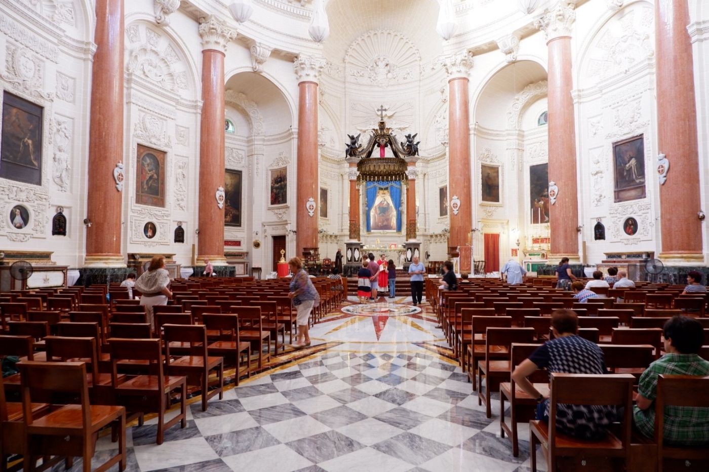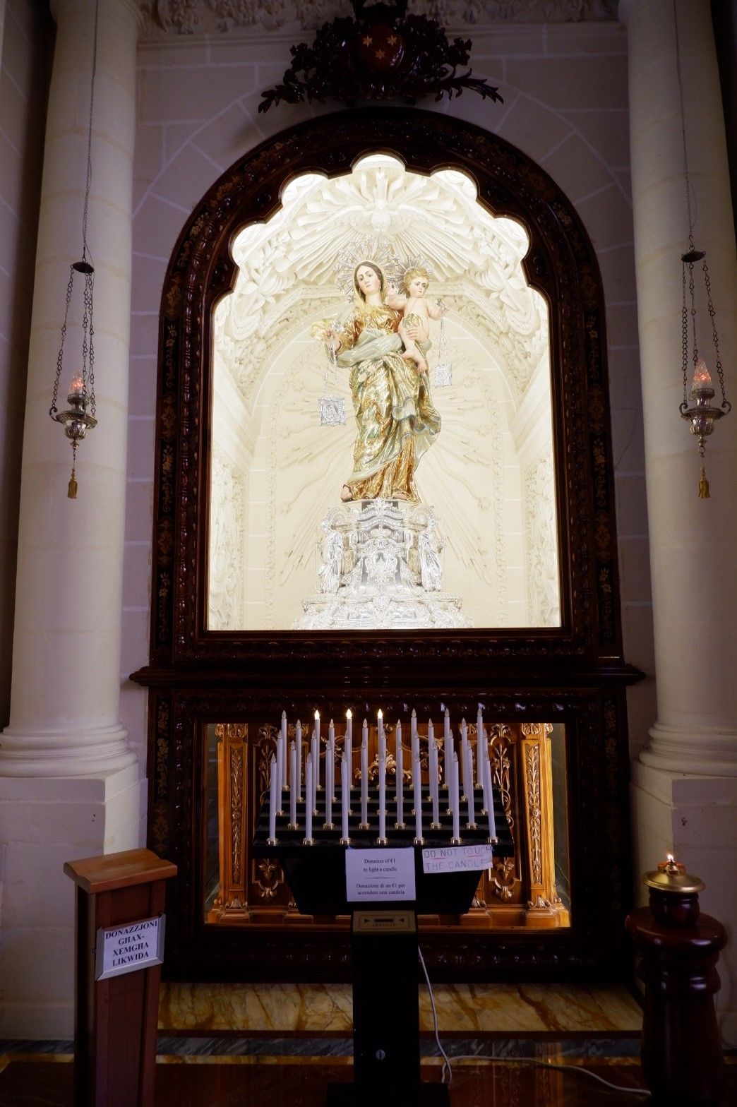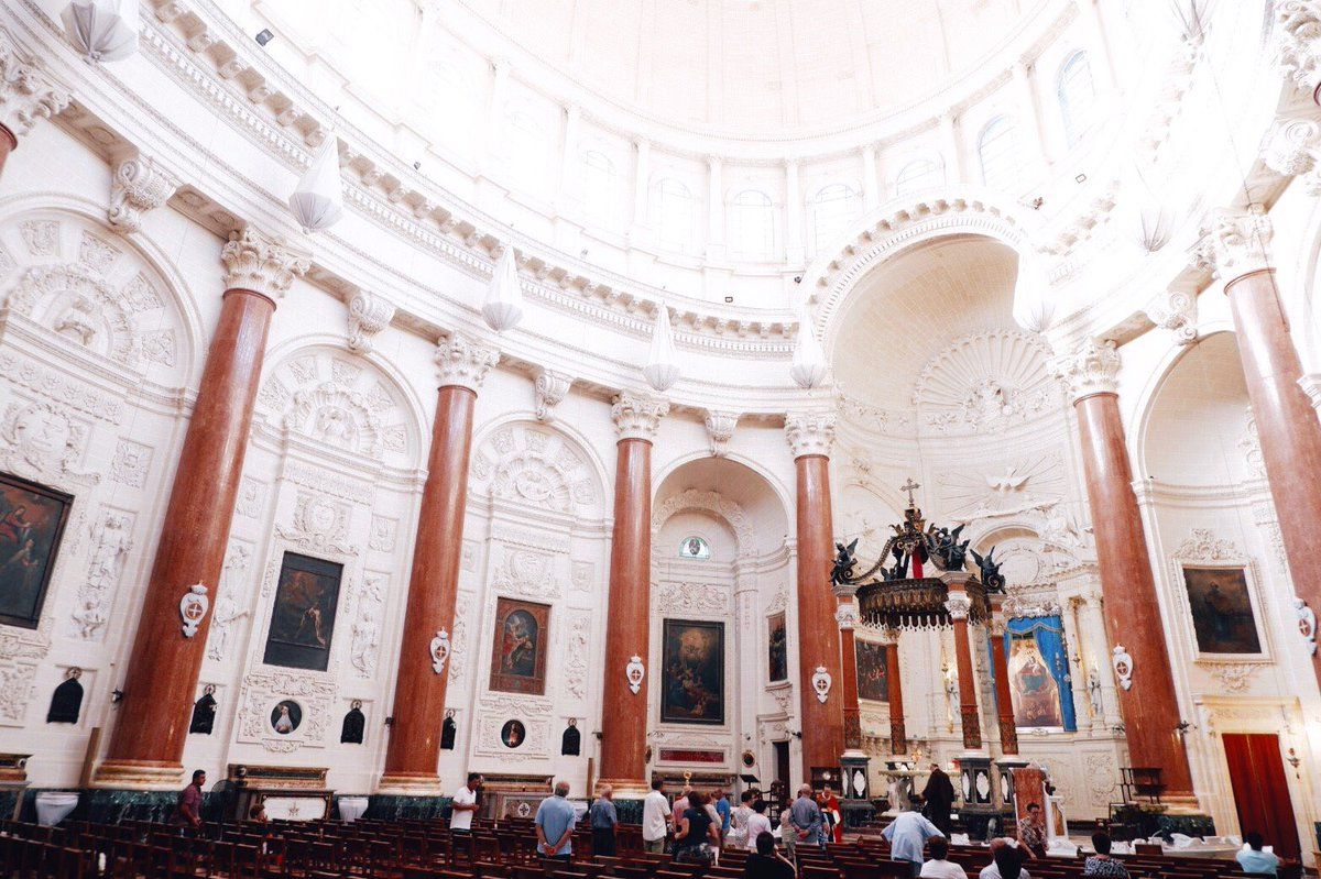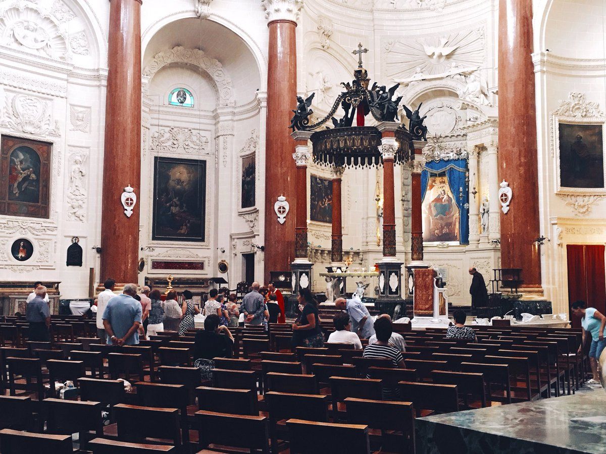 ส่วนโบสถ์ในภาพนี้คือโบสถ์ Our Lady Of Mt.Carmel หรืออีกชื่อหนึ่งคือ Carmelite Church เป็นโบสถ์ของศาสนาคริสต์นิกายโรมันคาทอลิก สร้างขึ้นประมาณ ปี ค.ศ.1570 สถาปัตยกรรมแบบบาโรค ออกแบบโดย Gerolamo Cassar (ผู้ช่วยของ Laparelli ผู้ออกแบบผังเมืองวาเลตต้าที่เราเล่าไว้ตอนต้นว่าเขาจะมีความสำคัญต่อสถานที่สำคัญอื่น ๆ ในวาเลตต้า) ต่อมาในช่วงศตวรรษที่ 17 โบสถ์หลังนี้ถูกส่งมอบให้คณะคาร์เมไลท์ (Carmelites-คณะภราดาพระนางมารีย์พรหมจารีแห่งภูเขาคาร์เมล) ต่อมาในช่วงสงครามโลกครั้งที่ 2 โบสถ์หลังนี้ได้รับความเสียหายอย่างมาก จึงต้องสร้างขึ้นใหม่ตั้งแต่ ค.ศ. 1958-1981 ยอดโดมขนาดใหญ่ สูง 42 เมตรจึงทำให้โบสถ์เป็นจุดเด่นของอ่าว Marsamxett สูงกว่าหอคอยของโบสถ์นิกายแองกลิกันอีก สำหรับที่นี่ถ้าใครอยากแวะเข้าด้านในแต่งตัวเรียบร้อยซักหน่อยนะ เพราะเราเจอป้ายห้ามใส่สายเดี่ยว ส้นสูง ขาสั้น กระโปรงเหนือเข่า เหมือนศาสนสถานบ้านเรานี่แหละ