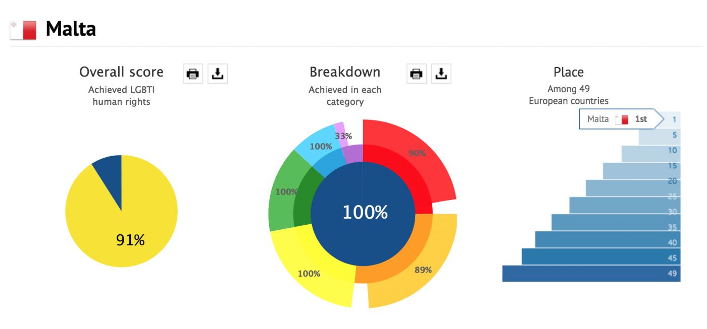 ไม่ใช่แค่นั้นถึงแม้ว่ามอลต้าจะมีความศรัทธาในศาสนาที่เข้มข้น แต่มอลต้ากลับเป็นประเทศที่เป็นมิตรกับเหล่า LGBTQ+ ด้วย ประเทศมอลต้าเป็นตัวอย่างที่ดีที่เรามองว่าน่าจะเป็นต้นแบบให้กับนักเคลื่อนไหวต่าง ๆ ได้ และทำได้จริงเกิดกฎหมายรับรองการแต่งงานระหว่างเพศเดียวกันเมื่อปีที่แล้ว เว็บไซต์ Rainbow Europe จัดให้ประเทศมอลต้าอยู่ในอันดับ1 เมื่อเทียบกับอีก 49 ประเทศในยุโรป และเป็นอันดับ 1 ที่ IDAHOT (International Day Against Homophobia, Biphobia and Transphobia) ที่จัดอันดับในปี 2017 นอกจากนี้รัฐบาลมอลต้าได้ริเริ่มที่จะใช้เครื่องหมาย X เพื่อที่จะไม่ต้องระบุเพศใดเพศหนึ่งให้ชัดเจน (Gender Neutrality) ในเอกสารราชการ