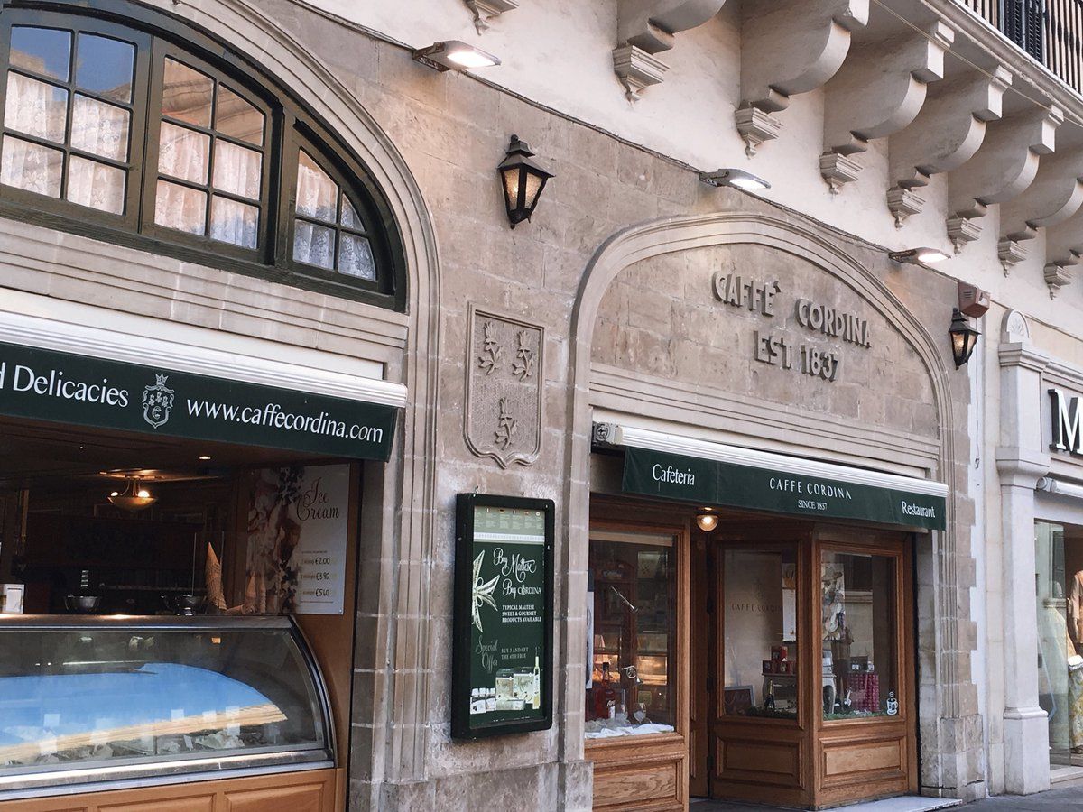 ตลอดทางนอกจากจะได้เห็นอาคารแบบมัลทีส บาโรค เราก็เจอร้านอาหารมากมาย ตามร้านต่าง ๆ ก็จะมีเมนูอาหารอิตาเลียนที่หาทานได้ง่ายที่นี่ กับอาหารพื้นเมืองมัลทีส นั่นคือเนื้อกระต่าย แต่อันนี้เราอดกินเพราะพ่อไม่ทาน เราก็เลยได้แต่มองป้าย อย่างในรูปด้านล่างนี้ก็คือคาเฟ่คอร์ดิน่า (Caffe Cordina) คาเฟ่และร้านอาหารของครอบครัวคอร์ดิน่า คาเฟ่นี้เป็นคาเฟ่ที่เก่าแก่ที่สุดในวาเลตต้า ก่อตั้งตั้งแต่ ค.ศ.1837