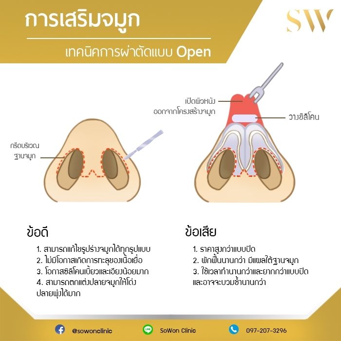 เป็นการผ่าเปิดจมูกเพื่อปรับโครงสร้างฐานจมูกโดยตรงเลยค่ะ การเสริมจมูกแบบโอเพ่นแบบนี้จะเป็นการผ่าตัดที่ค่อนข้างใหญ่ หากใครที่ยังลังเลว่าจะทำจมูกแบบไหนดี การผ่าตัดนี้จะช่วยในเรื่องของคนไข้ที่มีฮัมพ์ตรงสันจมูกด้วยนะคะ คนไข้ที่มีฮัมพ์ที่จมูกจะรอยนูนขึ้นมาตรงสันจมูก คุณหมอจะทำการตอกสันหรือว่าตะไบฮัมพ์ตรงนี้ได้ง่าย แต่แผลผ่าตัดของการทำจมูกแบบเปิดก็จะมากกว่าแบบปิด คนที่ปกติมีแผลเป็นง่าย หรือเป็นคีลอยด์ง่ายตรงระวังให้ดีนะคะในการดูแลแผลหลังการผ่าตัดนะคะ เช่น ทานอาหารเสริมที่ช่วยลดรอยแผลเป็น หรือคีลอยด์ แต่อย่างไรก็ตามการทำจมูกแบบเปิดแพทย์สามารถปรับโครงสร้างหรือตกแต่งทรงจมูกได้ง่ายกว่า ใครที่สะดวกแบบนี้ก็จัดได้เลยค่า