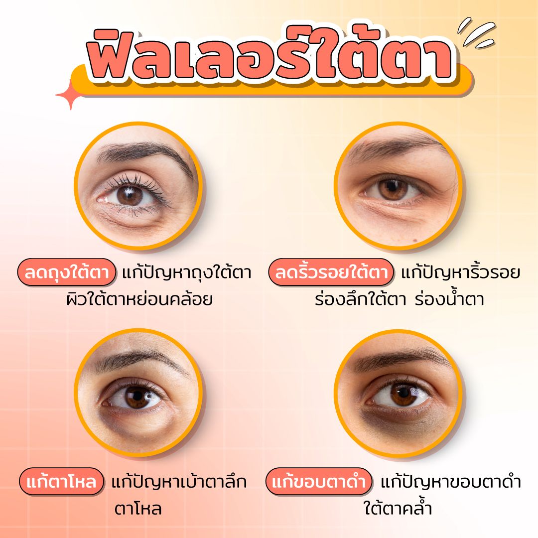 ฉีดใต้ตา เป็นการฉีดสารเติมเต็มเข้าไปยังบริเวณใต้ตา ซึ่งสารเติมเต็มที่ได้รับความนิยม และปลอดภัย คือ สารเติมเต็มฟิลเลอร์ประเภทไฮยารูรอนิค แอซิด ที่สามารถแก้ปัญหาใต้ตาจากหลายสาเหตุครับ เช่น