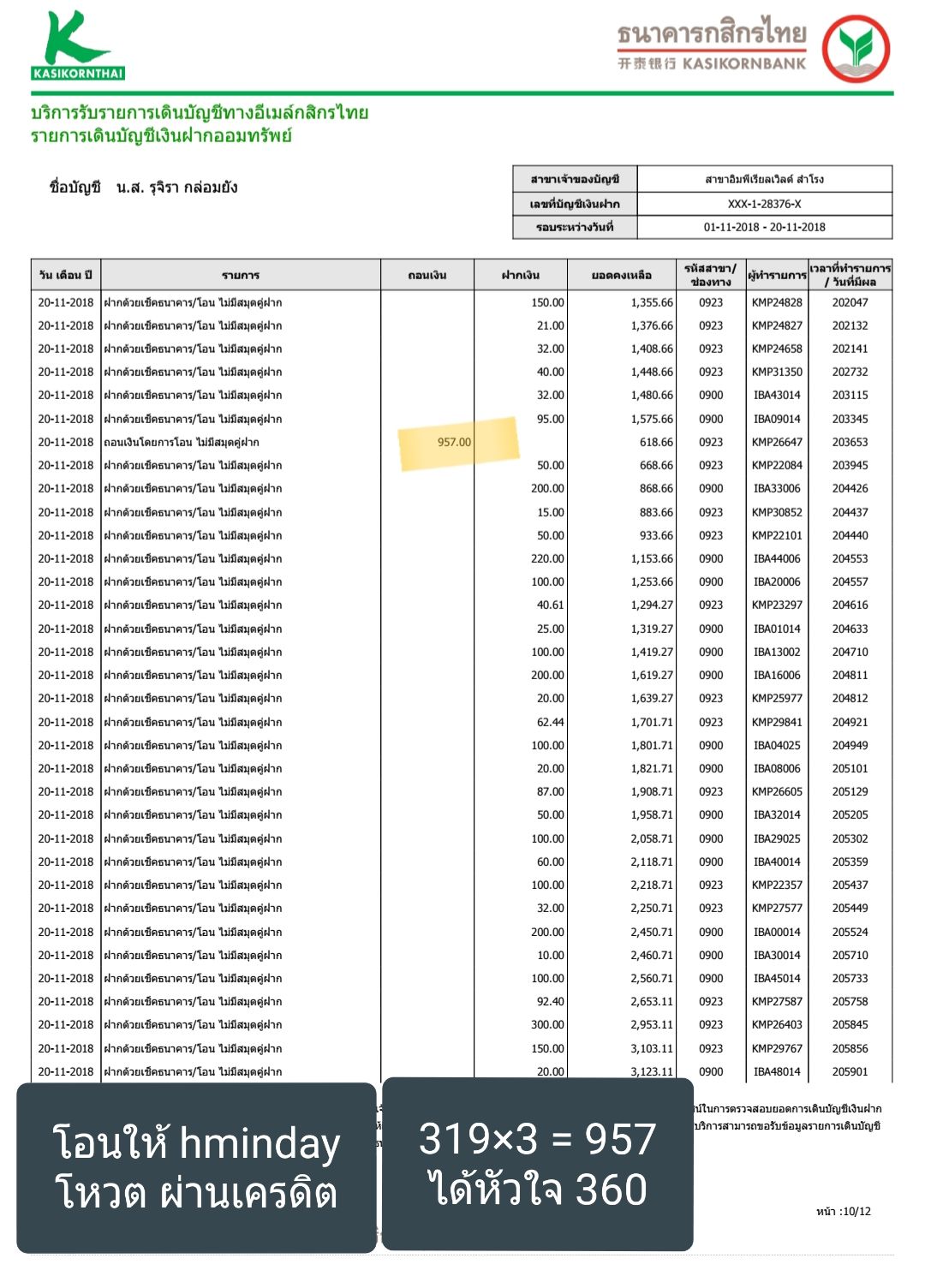 ครบทั้ง12 ใบที่เราทำเรื่องขอมาจากแอปกสิกรนะคะ ในตอนแรกเราแคปมาจากแอป และสรุปให้ทุกคนฟังมา 2-3 รอบแล้วใช่ไหมคะ แต่ปรากฎว่ารอบล่าสุดคือเมื่อวานล่าสุดดูได้แค่ 17.00 น. ซึ่งก่อนหน้านั้นเราสรุปถึงแค่ 13.00 น. คือยอดมันเข้าถี่มาก แอปเลยดูย้อนหลังมากไม่ได้ เราก็เลยเอาตัวจริงแบบนี้มาเลยแล้วกัน แต่มันก็ค่อนข้างละเอียดดีนะคะ เดี๋ยวเราจะรวมยอดให้ดูเลยนะคะ