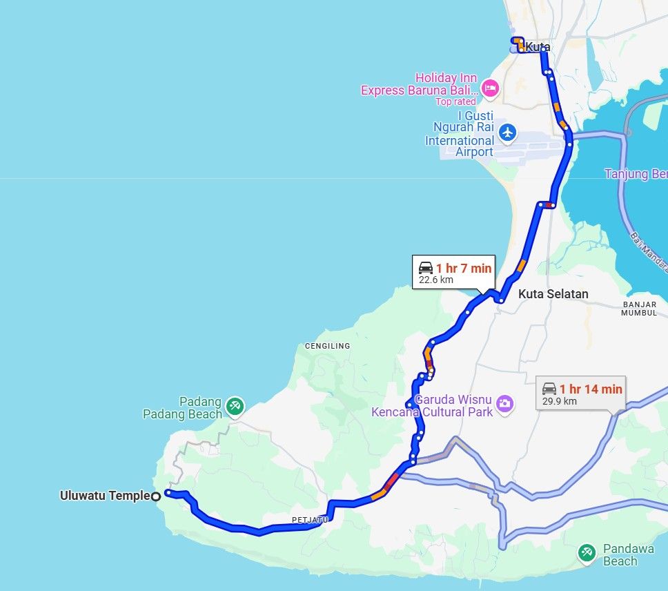วัดอูลูวาตู (Uluwatu Temple) หนึ่งในวัดฮินดูที่เก่าแก่ที่สุดในบาหลีที่ตั้งอยู่บนยอดผาสูง ท่ามกลางวิวของท้องทะเลชวา (Java Sea) ใครที่อยากดูวิวพระอาทิตย์ตกแบบจุใจ เอาให้ฉ่ำขั้นสุดก๊อตแนะนำให้มาดูที่นี่ได้เลย เพราะวิวพระอาทิตย์ตกดินของ วัดอูลูวาตู (Uluwatu Temple) นั้น เค้าขึ้นชื่อว่าเป็นอีกหนึ่งจุดชมวิวพระอาทิตย์ตกที่สวยที่สุดอีกแห่งหนึ่งในบาหลี ออกจากวัดอูลูวาตู เสร็จเราเดินทางกันต่อที่ Kuta Beach เนื่องจากระยะทางค่อนข้างไกล ถ้าดูจาก Maps ประมาณ 1 ชั่วโมง และเราใช้เวลาอยู่ที่วัดอูลูวาตู ค่อนข้างนาน