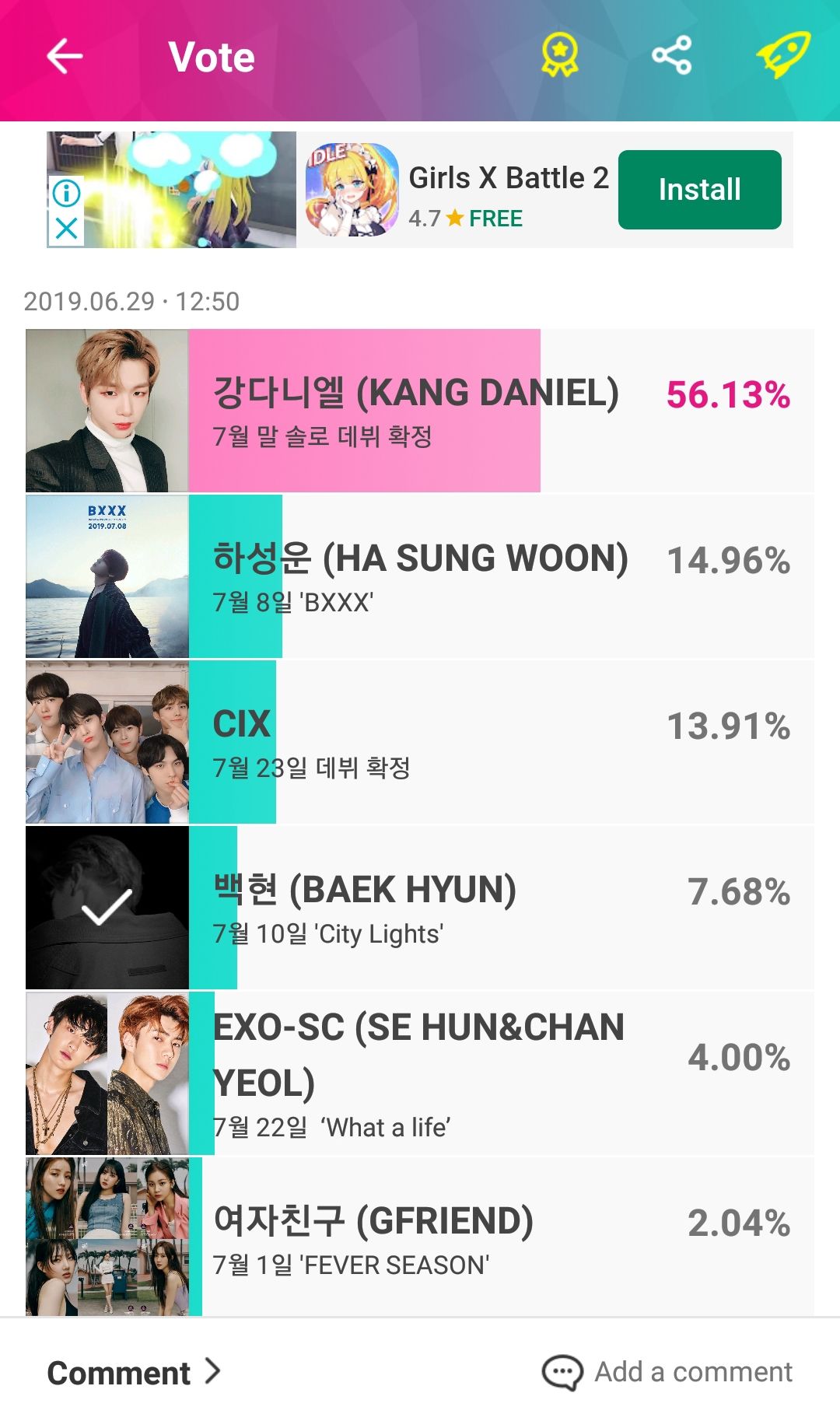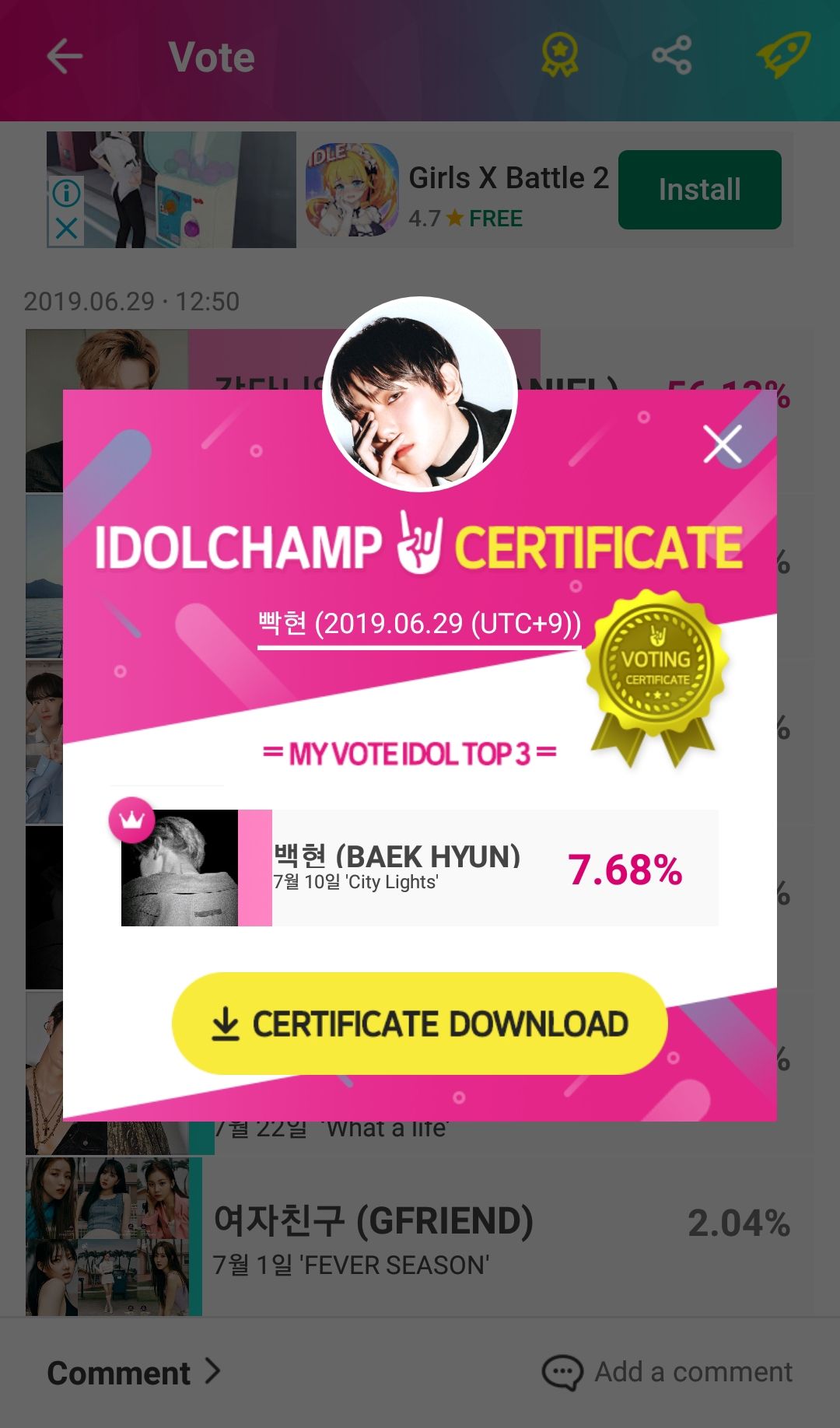 เมื่อเรากดโหวตครบ 30 ครั้ง (เรายกตัวอย่างโหวตแบคฮยอนนะคะ) จะขึ้น% โหวตมาให้ตามภาพ
