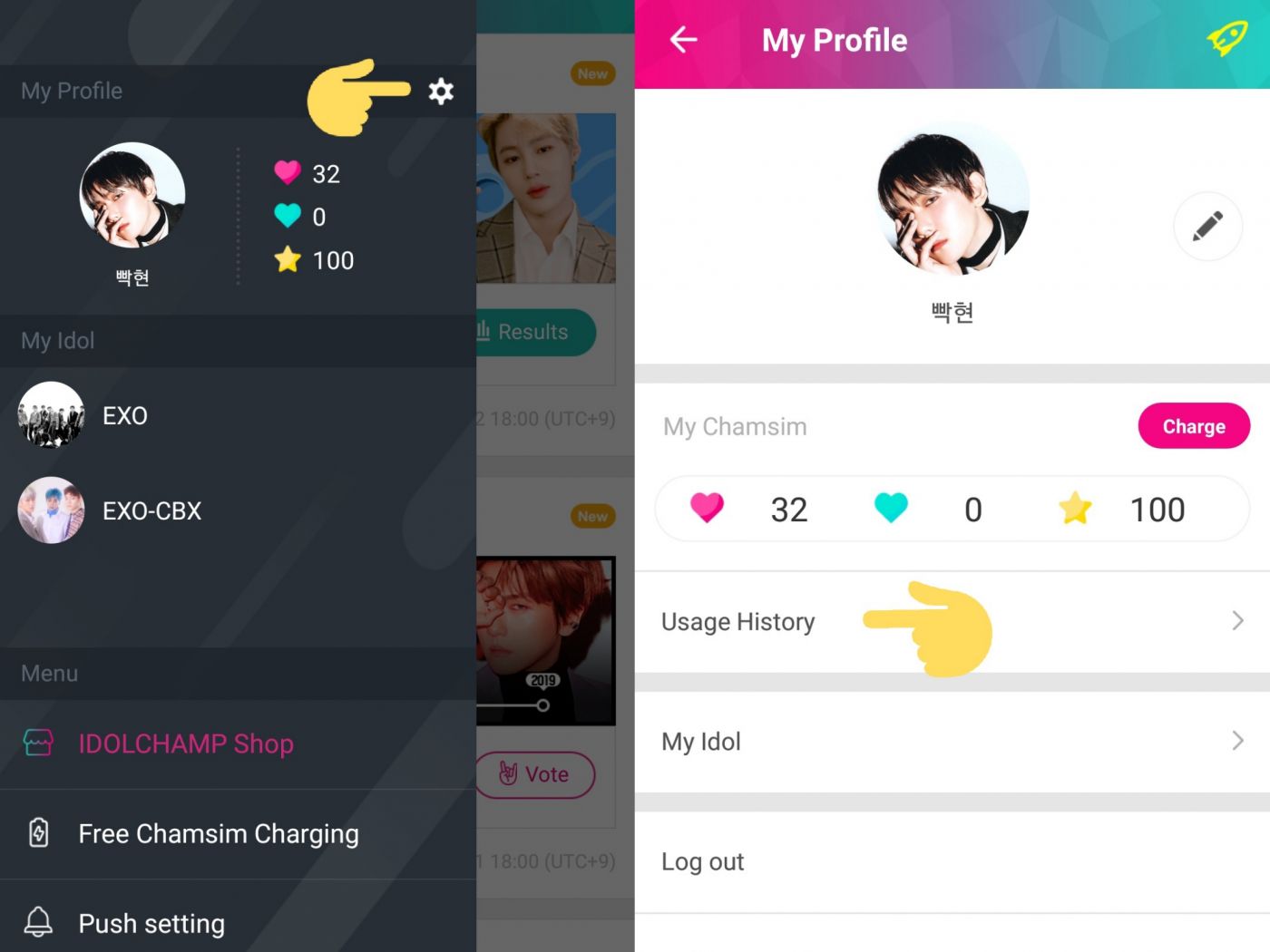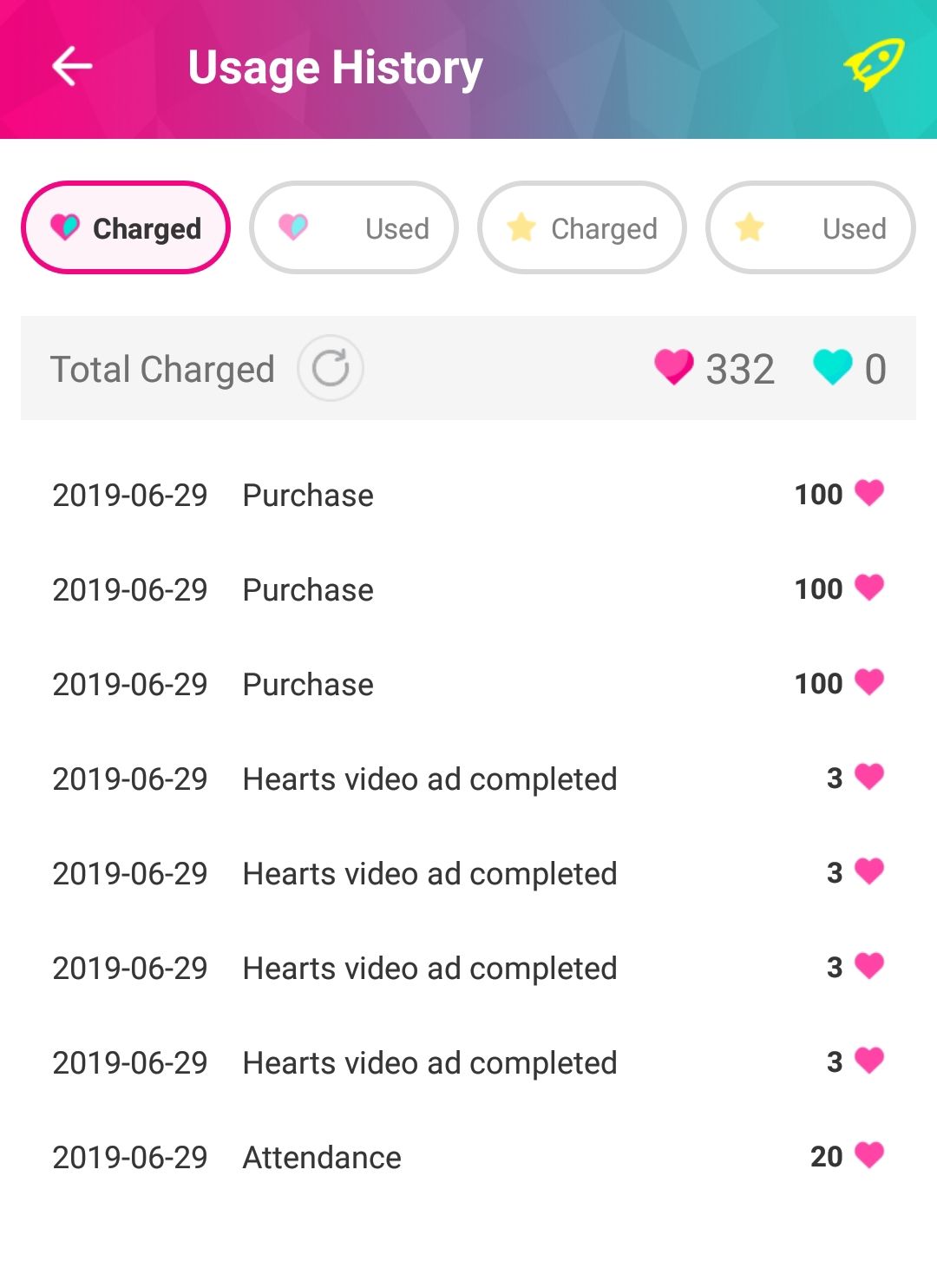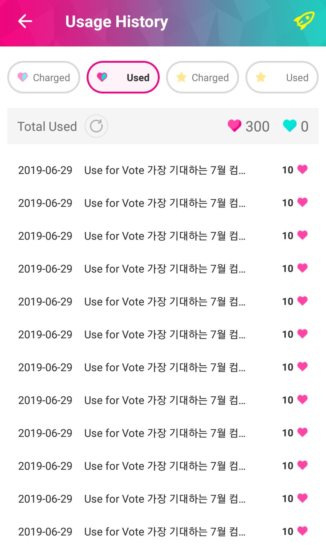 •          แอปนี้ก็สามารถเช็คประวัติได้นะคะว่าเราซื้อหรือได้รับหัวใจไปเท่าไหร่ และใช้โหวตไปเท่าไหร่