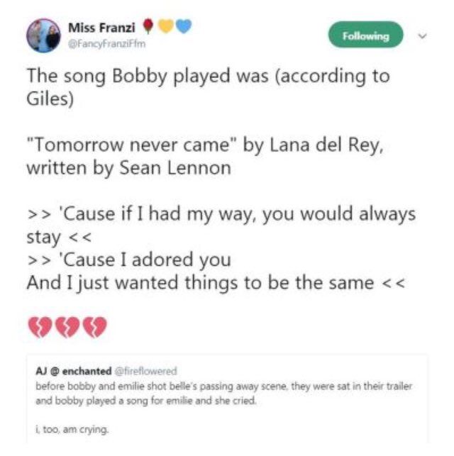 เสียงกีตาร์คลอแผ่วเบา พร้อมเสียงทุ้มต่ำที่เริ่มขับขานบทเพลงเนิบช้า ปลุกเอมิลี่ขึ้นมาจากภวังค์ หล่อนจำเพลงนี้ได้ เคยได้ยินมันบ้างเป็นครั้งคราวเมื่ออยู่กับโรเบิร์ต เขาเคยบอกว่าเขาชอบมัน และเอมิลี่มีความกล้าพอที่จะถามเขาว่าเหตุใดเขาจึงไม่เปิดมันบ่อยนัก คำตอบที่ได้กลับมาคือใบหน้าของเขาที่ปรากฏรอยยิ้ม, รอยยิ้มที่เอมิลี่รักนักหนา