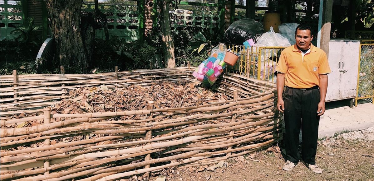 ยอมรับว่าเขาไม่เคยบอกเลย ลุงทำงานมา 4 ปี ลุงก็ยังสงสัยว่าหน้าที่ของนักการฯ คือให้ทำอะไร ตอนแรกที่เข้ามาใหม่ๆ ลุงก็เอาแต่ถูพื้น ถูตั้งแต่เช้าจรดมืดแบบไม่ได้ดูเวลาเลย แล้วเวลาผ่านไปเร็วมาก ก็เพราะว่าลุงเคยทำงานที่หนัก ทำเกษตรกับเลี้ยงวัวเป็นงานที่หนัก แต่พอให้มาถูพื้นมันเป็นงานเบา ลุงถูได้ทั้งวันจนมีความรู้สึกว่าเวลามันเหลือ ลุงก็เลยหันมาเพาะต้นไม้ จนเวลาของลุงหมดไปกับต้นไม้เยอะมาก พอลุงเห็นที่ไหนมีต้นไม้ลุงก็จะเด็ดยอดมา เด็ดกิ่งมา แล้วนำมาชำ เสร็จแล้วก็คิดว่าจะทำยังไงที่ไม่ต้องมาเสียเวลารดน้ำตลอดเวลา ก็เลยคิดว่าจริงๆ เด็กๆ ต้องใช้น้ำกันอยู่แล้ว ลุงก็เลยทำร่องทำแอ่ง เอาถุงมาตัด แล้วเอาดินมาใส่ตั้งๆ ไว้ พอเจอกิ่งอะไรก็เอามาเสียบ ถึงเวลาต้นไม้ก็ได้ความชื้นจากดินก็จะแตกกิ่งก้าน ลุงก็เอามาใส่กระถาง แล้วนอกจากที่ลุงเพาะต้นไม้ ก็จะมีอย่างเช่น ใบไม้เนี่ย พอถึงฤดูกาลมันก็จะร่วงเยอะ เมื่อก่อนลุงใช้วิธีเก็บใส่ถุงแล้วนำไปไว้หลังโรงเรียน หลังจากนั้นเอาไปปูไว้บนดิน เพราะลุงเคยทดลองเองที่บ้านและได้รู้ว่าตามธรรมชาติแล้วใบไม้เมื่อได้ลงดินก็จะได้รับความชื้น พอชื้นก็มีสัตว์ต่าง ๆ พวกไส้เดือน กิ้งกือ คางคก มาช่วยพรวนดิน ช่วยให้ดินมีสารอินทรีย์ พอได้ลองเอาไปปลูกต้นไม้แล้วก็เห็นเลยว่าต้นไม้งาม ฉะนั้นทุกอย่างที่ลุงทำลุงจะใช้ใจบวกกับความรู้ จินตนาการ และสภาพแวดล้อม