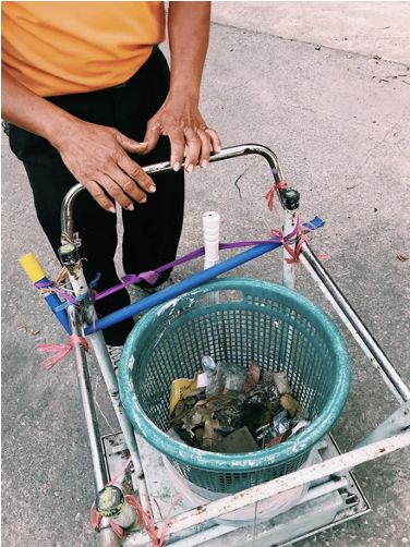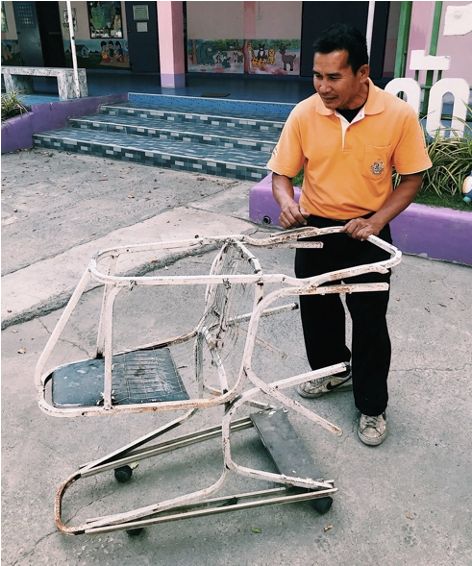 มาจากใจกับปัญหา อย่างเช่น รถเข็นขยะ เรามองว่าถ้าเรามีรถเข็นมันจะสบายขึ้น บางทีกวาดได้ครู่เดียวก็เต็ม ต้องเดินกลับไปกลับมาเพื่อทิ้งขยะในถัง มันเปลืองเวลา เราก็เลยคิดขึ้นมาว่าเวลาเราไปห้าง เขามีรถเข็นใส่ของ เอ้อ มันดีเนอะ เราก็ดัดแปลงได้นี่หน่า เรามีเหล็กมีอุปกรณ์ พอมองแล้วจินตนาการภาพของรถเข็น ก็นึกได้ว่าเก้าอี้ที่เราเก็บไว้มันรูปร่างคล้ายกับรถเข็น ก็เลยลองจับมันมาแบบไม่ได้วางแบบเลยนะ ก็ลงมือทำตอนนั้นเลย ตัดๆ ประกอบๆ ใช้เวลาไปหนึ่งชั่วโมง ถ้าเราตั้งใจทำอะไรทุกอย่างก็จะลงตัว เรามีอุปกรณ์ทุกอย่าง ทั้งล้อ โต๊ะ เราเห็นว่าโต๊ะนี้มันดีแต่มันใช้ไม่ได้แล้ว ลองจับมันหงายขึ้น ใส่ล้อเข้าไป ก็จะเห็นว่าต้องเพิ่มอะไรเวลาใช้งาน แล้วก็จะต่อยอดไปทีละนิดทีละหน่อย เราคิดอย่างเดียวว่าทุกอย่างที่เราเก็บไว้สักวันมันจะต้องมีประโยชน์