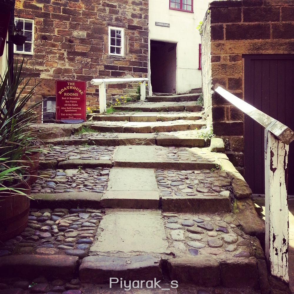แล้วลัดลงไปตรงบันไดบ้านที่อยู่ด้านล่างของโบสถ์ หยุดตรงถนนกลางเมือง