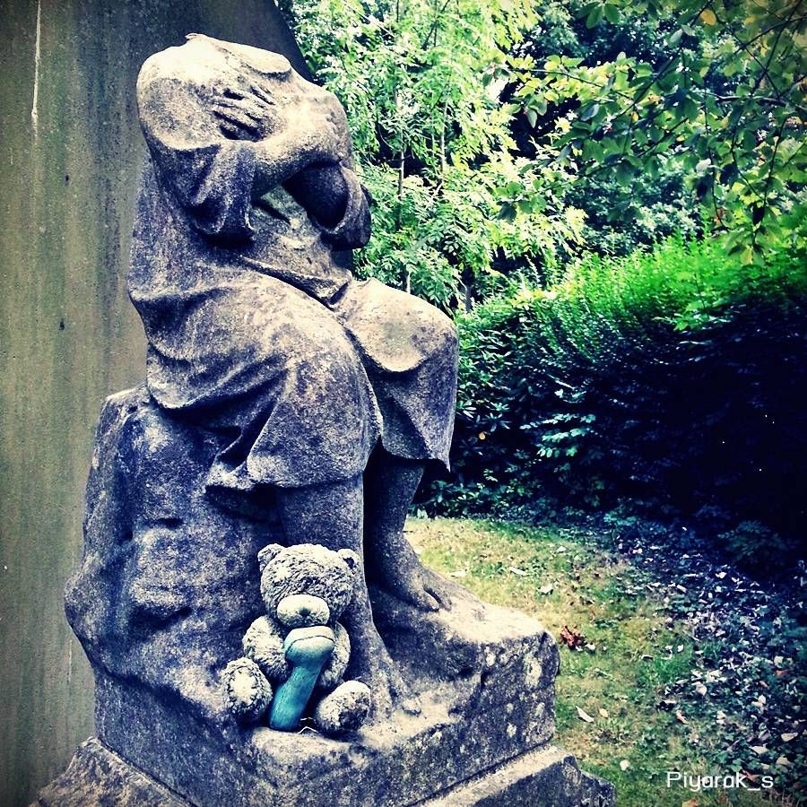 หลุมศพบริเวณใกล้เคียงกับจุดนัดพบก่อนทัวร์สุสาน คุณอลันเล่าว่า เจ้าของหลุมศพเป็นเด็กเลยแกะสลักรูปนี้เอาไว้ ถ้าจำไม่ผิด หัวรูปสลักหักเพราะมีคนมือบอนไปทุบ เข้าใจว่าจะเมา (ตอนที่ไปยังไม่ได้ซ่อม แต่ตอนนี้ซ่อมแล้ว มีหัวแล้ว) มีคนเอาตุ๊กตามาวางไว้ให้ด้วย