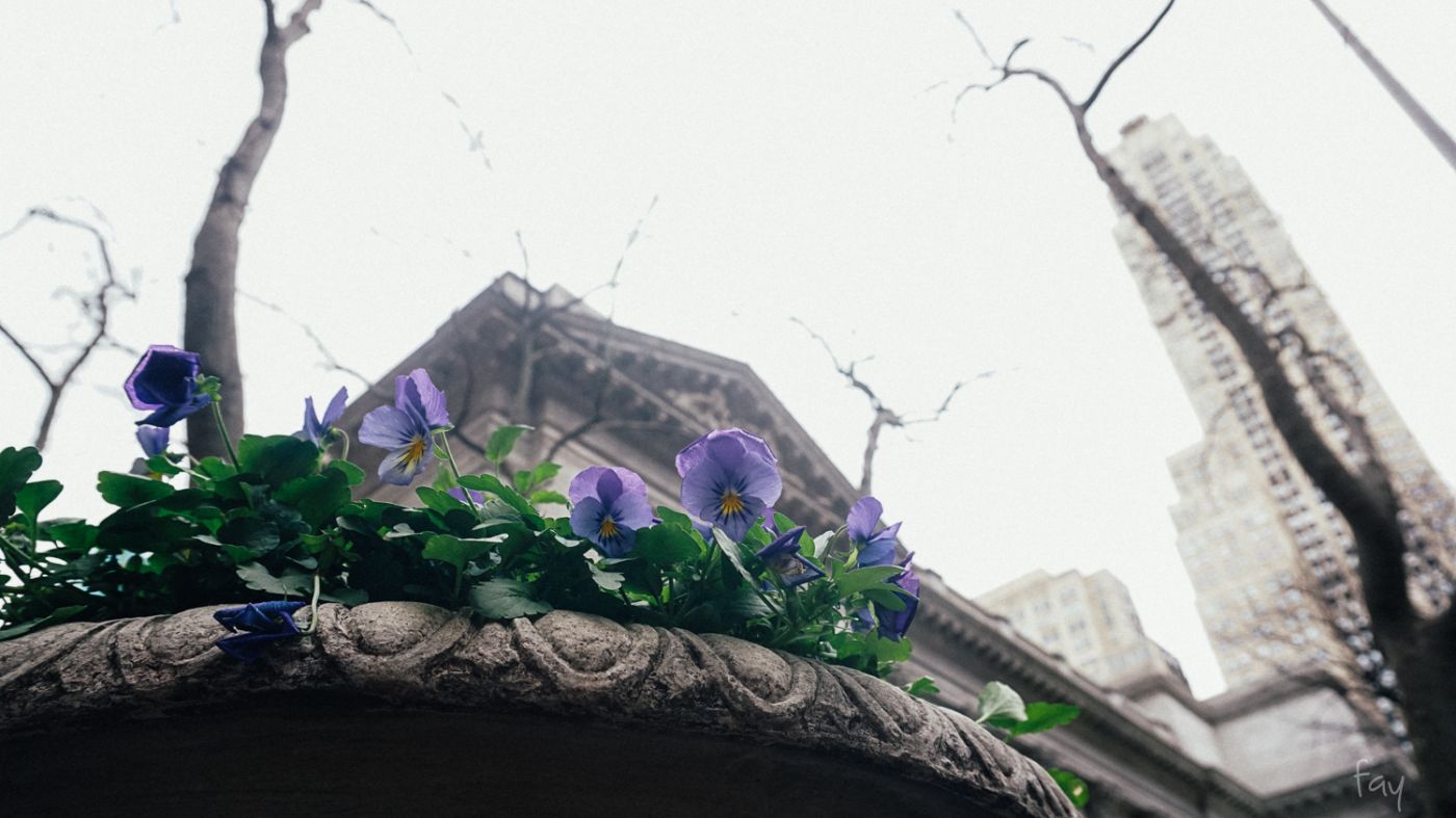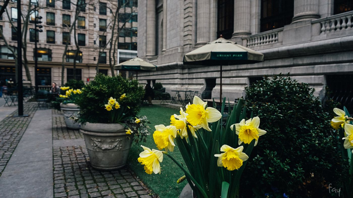 New York Public Library นี้มีพื้นที่ติดกับสวน Bryant Park สวนสาธารณะขนาดไม่กว้างขวางมากมายแต่อุดมไปด้วยผู้คน เพราะอยู่ใจกลางมิดทาวน์ ช่วงที่เราไปนั้นเข้าสู่ฤดูใบไม้ผลิเรียบร้อยแล้ว อากาศไม่หนาวไม่ร้อน** มีฝนประปราย ดอกไม้เริ่มผลิบาน ชอบความรู้สึกแบบนี้ มองไปทางไหนก็มีแต่ดอกไม้สวยๆ ต้นไม้ผลิใบ ดูแล้วอารมณ์ดี
