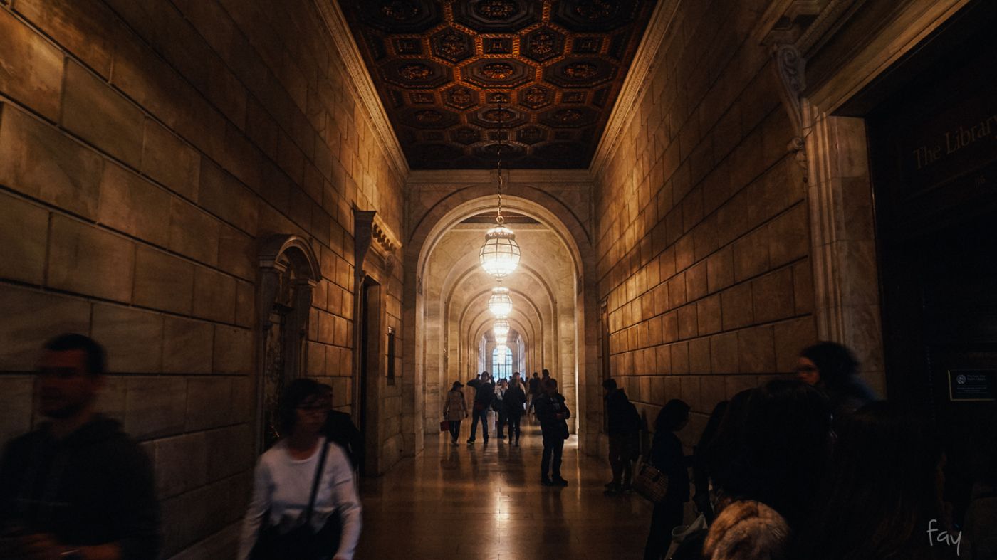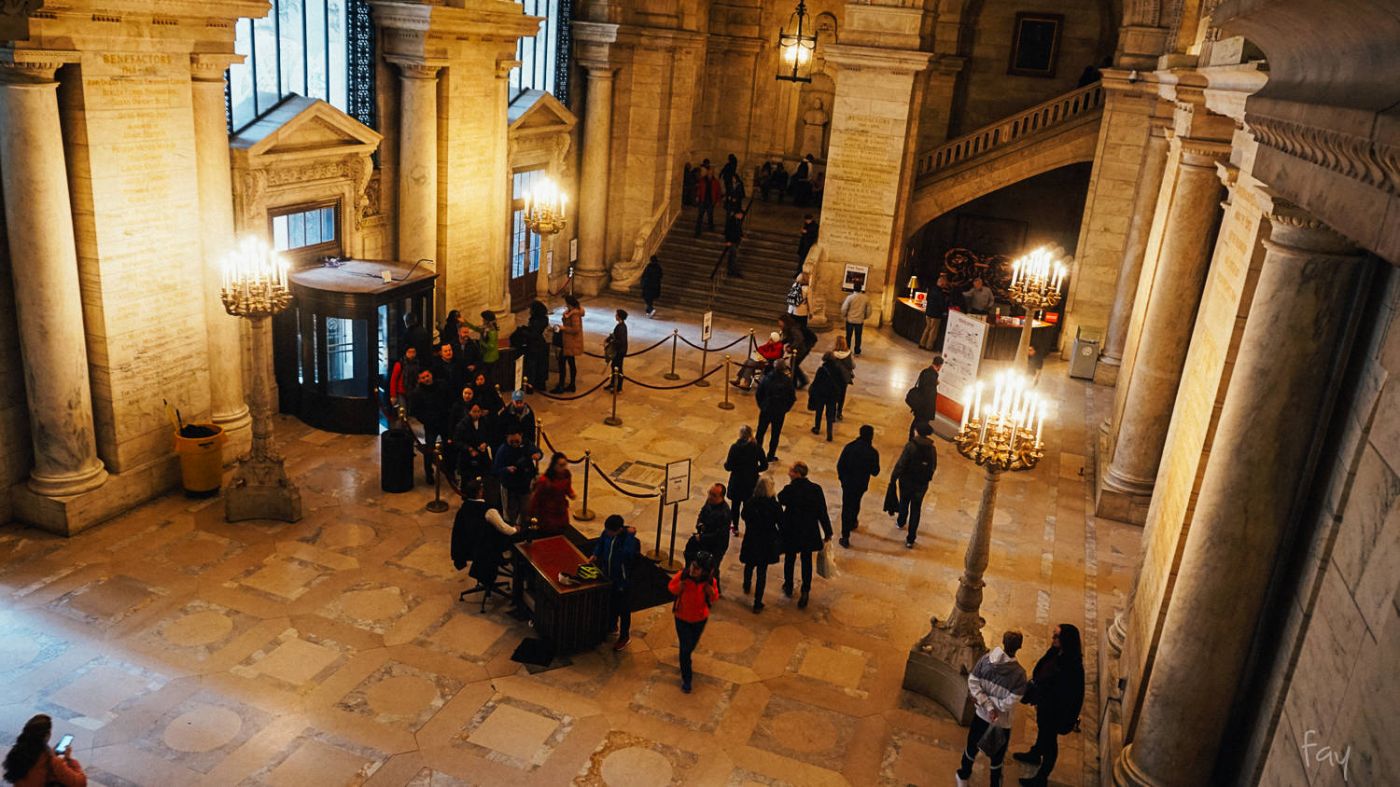 ห้องสมุดประชาชนนิวยอร์กนี่เปิดให้เข้าฟรี มีขนาดใหญ่เป็นอันดับ 2 ของประเทศสหรัฐอเมริกา สร้างมาตั้งแต่ปี 1895 เปิดตั้งแต่ 10 โมงจนถึง 6โมงเย็น ไม่ได้เป็นที่สำหรับรวบรวมหนังสือให้อ่านหรือสืบค้นทางวิชาการอย่างเดียวนะ ที่นี่ยังมีนิทรรศการหมุนเวียนกันมาจัดอยู่เป็นระยะๆอีกด้วย ส่วนทัวร์ศูนย์เหรียญอย่างเรา จุดประสงค์ที่เข้ามาวันนี้ก็คือ