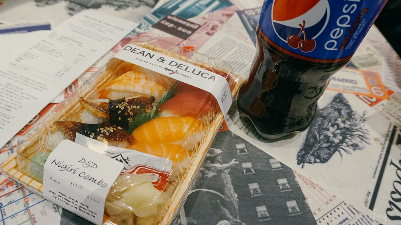 อาหารพร้อมทานที่นี่จะมีราคาราว 10$ ขึ้นไป (จำพวกแซนวิช) ส่วนเราเดินวนหนึ่งรอบแล้วก็ตัดสินใจจัดซูชิเซ็ตละ 13$ มาเป็นอาหารเที่ยง (แพงกว่าค่าเข้า The MET อีกนะแม่คุณ) เป็นข้าวนอกบ้านมื้อแรก ที่รู้สึกว่ายังไงกูก็กินได้วะ แล้วก็เดินไปสั่งเครื่องดื่มชูวิญญาณที่เคาเตอร์ ซึ่งโคตรเขรอะค่ะคุณขา ผิดกับบ้านเราลิบลับ
