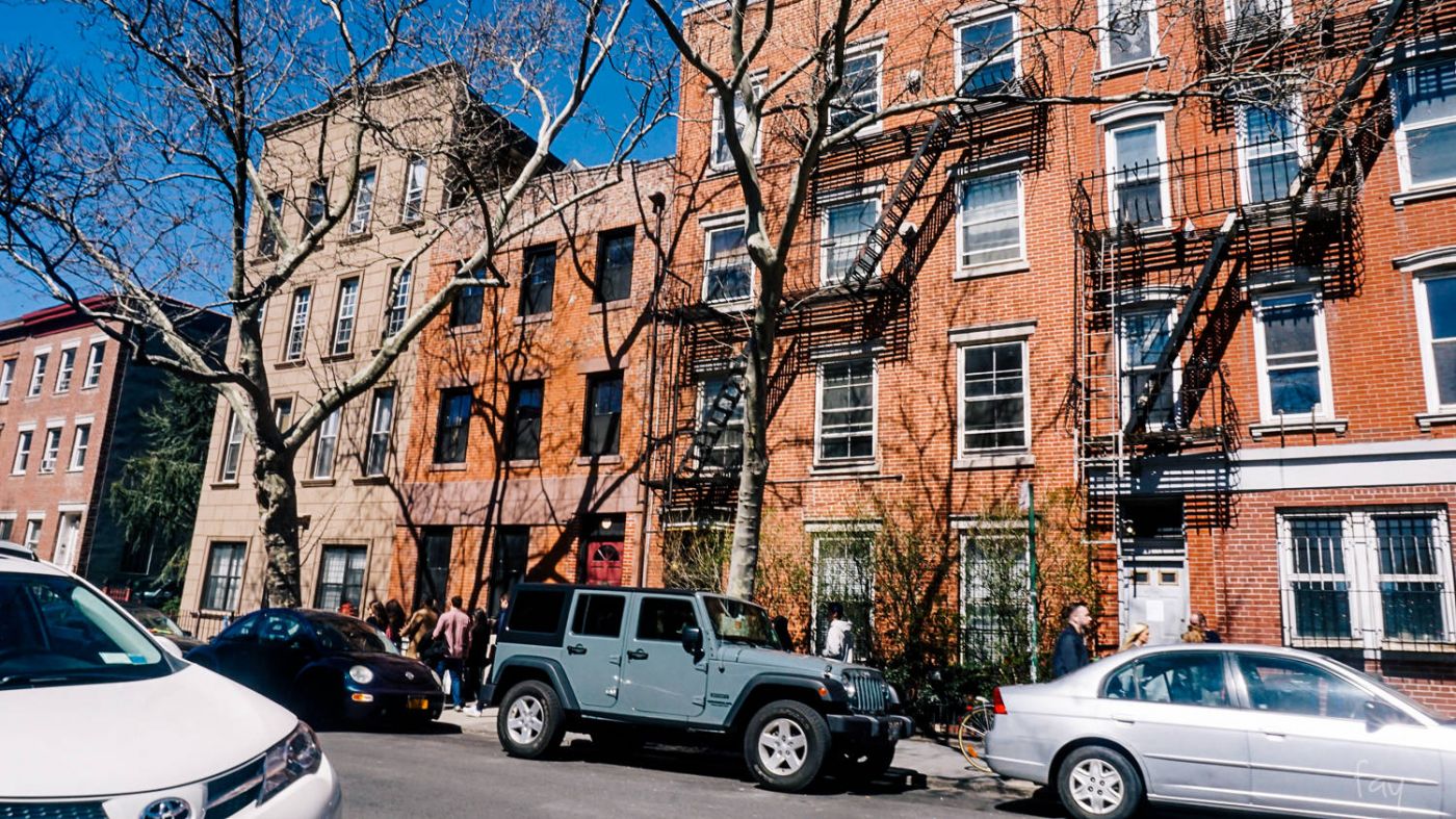 ดูเหมือนบรูคลินจะมีตึกสูงๆน้อยกว่าแมนฮัตตัน และยังคงเดิมด้วยบ้านเรือนอายุเก่าแก่ ระหว่างทางเดินกลับ รอบข้างเราแวดล้อมไปด้วยตึกเตี้ยๆ หรือที่เขาเรียกว่า Brownstone จริงๆแล้ว Brownstone แบบนี้ก็มีอยู่ทั่วไปในนิวยอร์ก แต่ทางฝั่งบรูคลินจะมีมากเป็นพิเศษ (มันมีประวัตินะว่าทำไมต้องสร้างบ้านกับ Brownstone แต่อ่านแล้วไม่เข้าใจค่ะบอกตรงๆ) ส่วนอีกฝั่งก็จะเป็นตึกเตี้ยๆที่มีบันไดหนีไฟพาดอยู่เกือบทุกตึกจนกลายเป็นสัญลักษณ์ไปแล้ว ถ้าจะดูว่าตึกไหนเป็นอพาร์ตเมนต์เขาว่าให้ดูทางหนีไฟนี่แหละ แต่เดี๋ยวนี้มีหลายบ้านที่ถอดออกเพราะมันไม่จำเป็นต้องใช้ มันก็น่าเสียดายเหมือนกันนะ