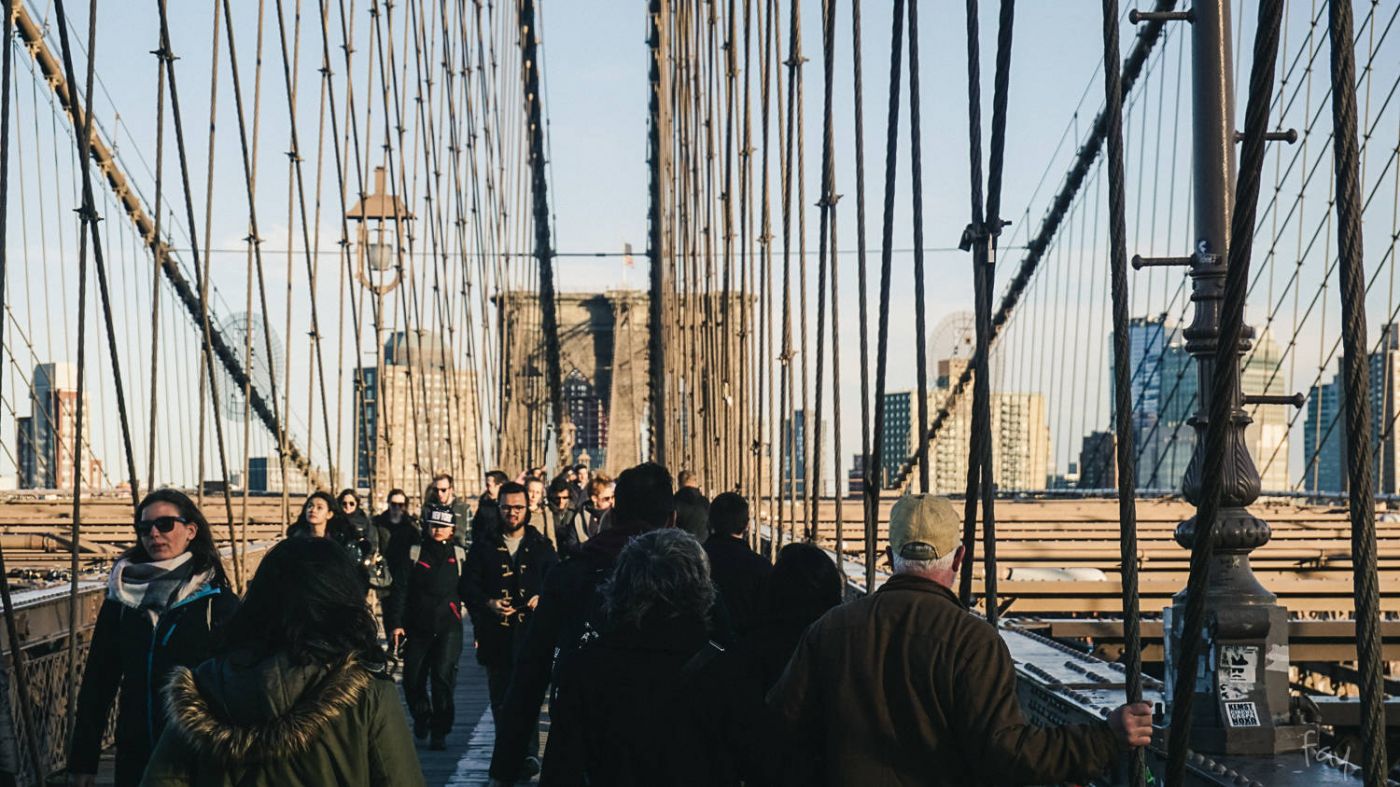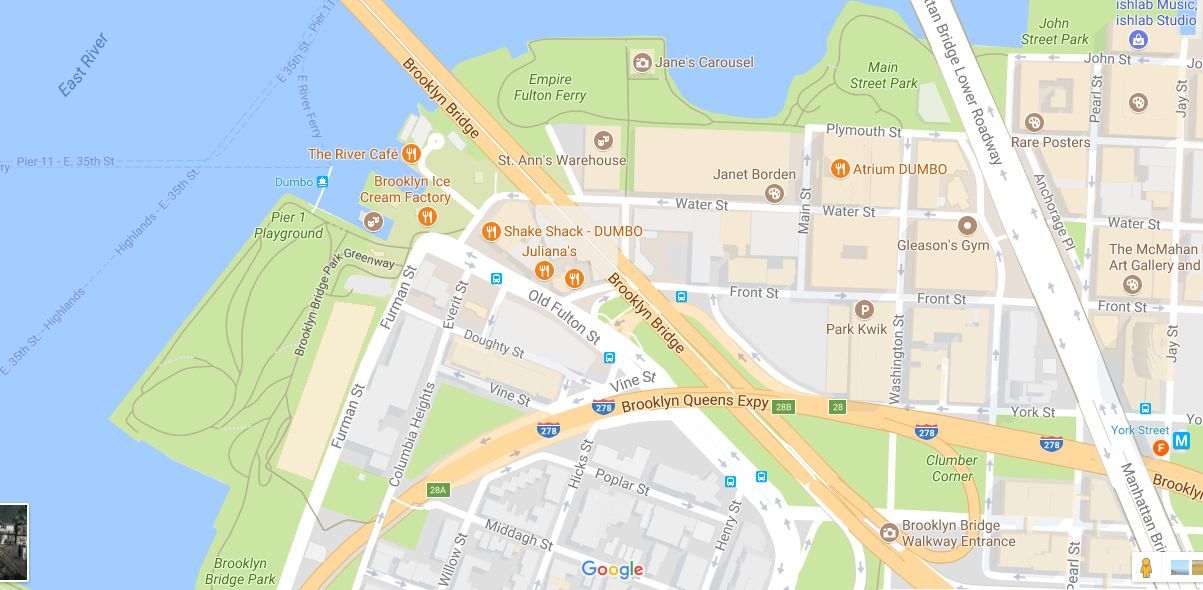ฝั่งบรูคลิน สถานี High Street Brooklyn Bridge สาย A,C (สีน้ำเงิน) หรือ สถานี York Street สาย F (สีส้ม) ระยะทางพอๆกัน