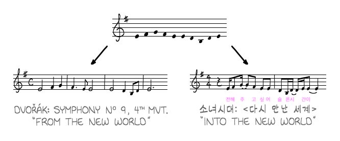 สิ่งที่ Kenzie ซ่อนไว้ในเพลง Into the New World คือทำนองจากท่อนสุดท้ายของ New World Symphony ซึ่งหากสังเกตจากในภาพ ด้านซ้ายคือโน้ตต้นฉบับที่ประพันธ์โดยดโวชาก ส่วนด้านขวาคือการนำตัวโน้ตเดียวกันทั้งหมดมาใส่เป็นทำนองร้องของเพลง Into the New World หากแต่มีการปรับเปลี่ยนจังหวะใหม่ให้แตกต่างไปจากเดิมเพื่อให้มีความทันสมัยยิ่งขึ้น