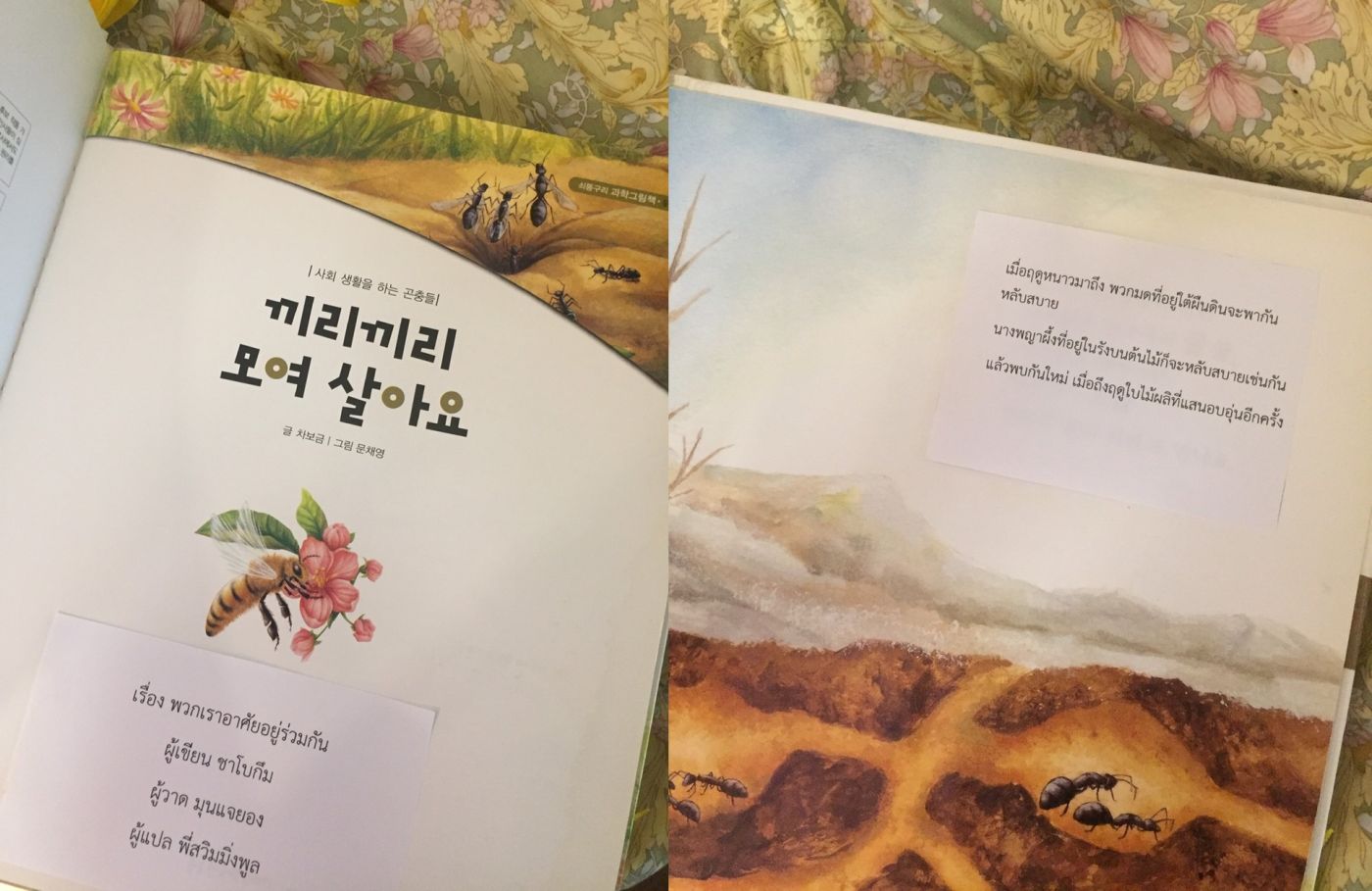 มาถึงอาทิตย์ที่สามในการทำงาน หนังสือที่เรามีโอกาสทำบรรณาธิการได้นำมาเข้าระบบให้เด็ก ๆ อ่านแล้ว (เย้ y-y) หนังสือเรื่อง 끼리끼리 모여 살아요 เป็นหนังสือภาษาเกาหลี ที่แปลไทยว่า พวกเราอาศัยอยู่ร่วมกัน ซึ่งมีผู้ปกครองใจดีแปลมาให้ แล้วเราก็ต้องนำคำแปลเหล่านั้นมาเรียบเรียง ปรับคำ เพิ่มลดคำ ให้เหมาะสำหรับเด็กและให้ตรงกับประเด็นสารดคีที่หนังสือต้องการนำเสนอ หลังจากเรียบเรียงแล้วก็ต้องนำข้อความเหล่านั้นมาแปะลงหนังสือ ซึ่งแปะเป็นแบบเปิดปิดได้ เผื่อเด็ก ๆ เกาหลีมาอ่านก็จะสามารถอ่านได้เหมือนเดิม เรารู้สึกภูมิใจเล็ก ๆ แม้จะเป็นเพียงการช่วยเรียบเรียง ปรับคำเท่านั้น แต่ก็เป็นส่วนสำคัญมาก ๆ สำหรับหนังสือสำหรับเด็ก