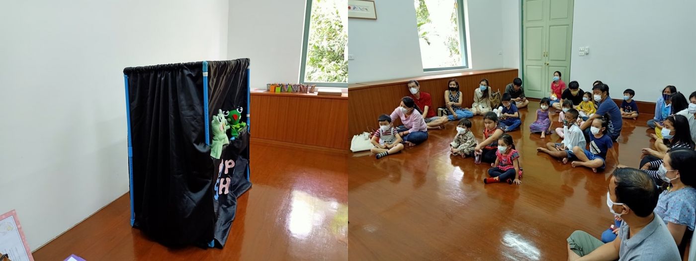 พอถึงวันแสดงจริงเราก็แอบซ้อมกันอีกนิดค่ะ เพราะต่างคนต่างไม่มั่นใจ ทั้งเราและเพื่อนเลย แสดงจริง ๆ แค่สิบสามนาที แต่เรากับเพื่อนตั้งใจซ้อมกันมากจริง ๆ จนต้องเตือนกันว่าถ้าไม่เลิกซ้อมจะปวดแขนแล้วรอบจริงจะทำให้ตัวละครมันต่ำลงมาจากฉาก ถึงเวลาแสดงจริงเราอยู่หลังฉากมองไม่เห็นเด็ก ๆ เลยค่ะ แต่ก็แอบแหวกม่านดู เห็นเด็ก ๆ ค่อยเข้ามาในห้องที่แสดง เรากับเพื่อนแสดงไปลุ้นไปว่าเด็ก ๆ จะตอบโต้อะไรมั้ย เวลาที่ตัวละครในเรื่องถามเด็ก ๆ ซึ่งเด็ก ๆ ก็ให้ความร่วมมืออย่างดีเลย น่ารักสุด ๆ เลยค่ะ y-y ตอนแสดงเรากับเพื่อนทำได้ดีกว่าทุกรอบที่ซ้อมเลย ไม่เกิดข้อผิดพลาดเลย สนุกกันมากจริง ๆ อาจเพราะว่าได้ยินเด็ก ๆ คอยตอบตลอดด้วย พวกเราเลยมีความมั่นใจและสนุกกันมากขึ้น พอแสดงจบพวกเราลุกขึ้นมาจากฉาก เห็นเด็กเยอะมาก ๆ ตกใจว่ามาจากไหนกัน 5555 ถ้าเห็นเด็กเยอะตั้งแต่แรกเราอาจจะตื่นเต้นกว่านี้ก็ได้ เลยคิดว่าดีแล้วที่เพิ่งมาเห็นตอนแสดงจบแล้ว