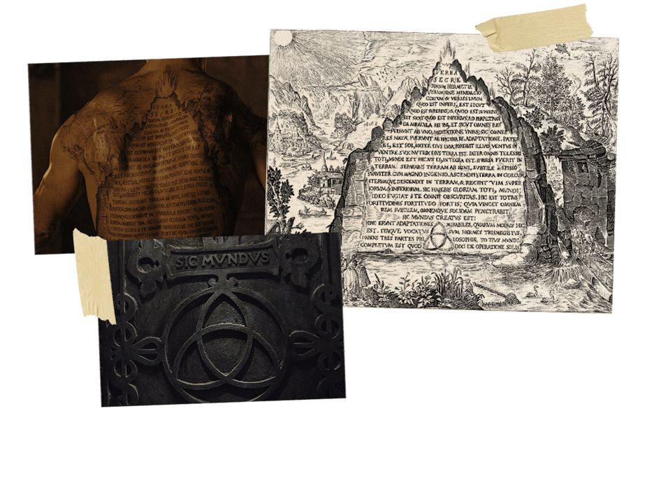 ลายสักบนหลังของโนอาห์คือ "คัมภีร์มรกต" หรือ "The Emerald Tablet" คัมภีร์ที่ยึดถือใน Hermeticism ซึ่งเป็นศาสนาหรือปรัชญาของเฮอร์เมส ทริสเมกิสตุส (Hermes Trismegistus) เป็นศาสนาที่เชื่อใน prisca theologia หรือศาสดาเพียงหนึ่งเดียว แม้ว่าจะเป็นเอกเทวนิยม แต่ Hermeticism เองก็เชื่อในสิ่งอื่นด้วย เช่น เทวดาและจักรวาล
