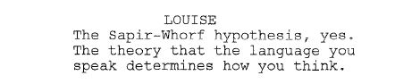 สาธยายมาเสียยืดยาว กลับมาที่ Arrival กันบ้าง อย่างที่รู้ว่ามนุษย์มีภาษาที่มีขอบเขตจำกัด เราเลยเข้าใจแค่ที่เป็นอยู่ แต่ภาษาของพวกเอเลี่ยนหรือที่เรียกในหนังว่า heptapods นั้นแตกต่างออกไป พวกเขามีความรู้เรื่องเวลาแบบ nonlinear จากความรู้ในระดับสูงกว่าภาษามนุษย์ พวกเขาจึงมายังโลกเพื่อมอบสิ่งนั้นเป็นของขวัญให้กับพวกเรา ดังนั้นหากสามารถเรียนรู้ภาษา heptapods มนุษย์จะสามารถใช้ประโยชน์จาก linguistic relativity หรือภาษาสัมพัทธ์นี้ มาทำให้มนุษย์รับรู้เวลาในรูปแบบของพวกเขาได้ตาม Sapir-Whorf hypothesis