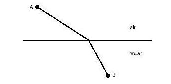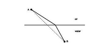 แล้วถ้าแสงเดินทางผ่านเส้นประที่ลากมาใหม่นี้ล่ะ ดูเหมือนจะใช้ระยะเวลาน้อยกว่า ทว่าเส้นทางนี้ ระยะทางส่วนใหญ่จะอยู่ใต้น้ำ และด้วยเหตุผลที่ว่าแสงเดินทางผ่านน้ำได้ช้ากว่าอากาศ ผลสุดท้ายจึงใช้ระยะเวลาในการเดินทางนานกว่า