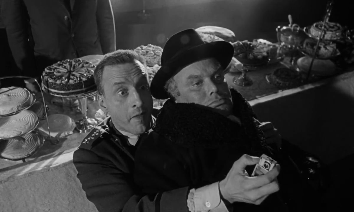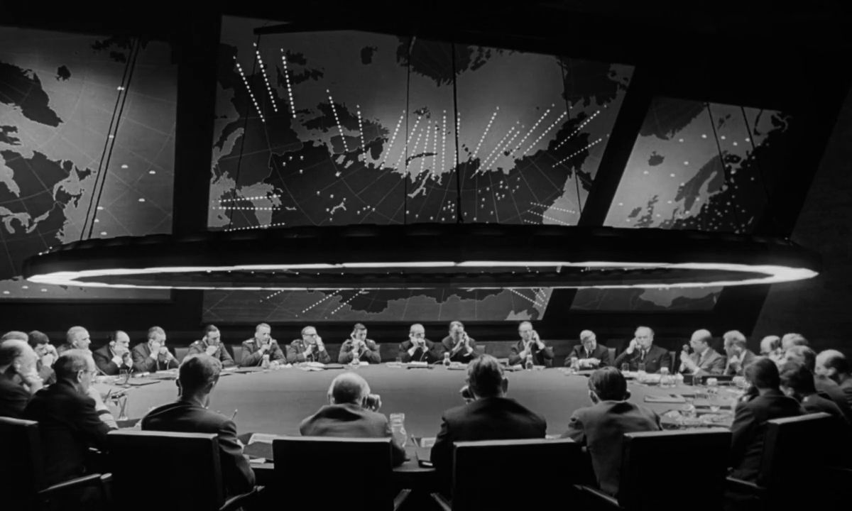 คูบริกถ่ายทำซีนนี้ในห้องที่มีขนาดกว้างถึง 100 ฟุต ยาว 130 ฟุต และเพดานสูงกว่า 35 ฟุต โดยมีโต๊ะกลมขนาดมหึมาและไฟฟลูออเรสเซนต์รูปวงกลมด้านบน ซีนทั้งหมดในห้องนี้ค่อนข้างกินระยะเวลายาวนานและดำเนินเรื่องโดยการใช้บทสนทนาเป็นหลัก เราจะได้พบกับตัวละครที่สำคัญเพิ่มอีก 3 ตัว