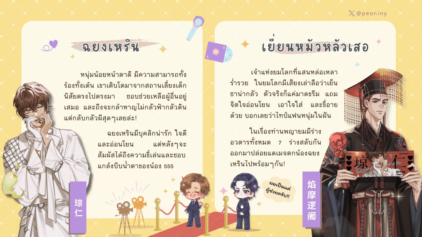 ส่วนโมเม้นต์ความรักจะออกแนวน่ารักๆอบอุ่นๆ อ่านไปเขินไปกับความซึนๆ ความรู้สึกอันเรียบง่ายและการพูดตรงๆที่ทำให้คนเขินตัวแตกได้ของท่านพญายม (⁄ ⁄>⁄ ▽ ⁄<⁄ ⁄) ส่วนน้องฉยงเหรินก็จะแนวขี้อ้อน มีลูกไม้มาตกท่านพญายมไม่ซ้ำแบบ และแค่เริ่มต้นก็ฮาไม่ไหวเพราะท่านพญายมดันหน้าแตกในบ้านผีสิง ทีนี้เลยต้องสลับเอาบรรดาร่างอวตารทั้งหมดออกมาต้องรับน้องวนไป แต่ไม่ว่าจะออกมาร่างไหนน้องก็จำได้อยู่ดี 555 แถมยังกลัวว่าท่านพญายมจะเสียหน้าเลยให้ความร่วมมือปิดบังความลับสุดฤทธิ์ ซึ่งแต่ละร่างอวตารของท่านพญายมก็จะมีรูปลักษณ์และนิสัยแตกต่างกันไปประหนึ่งได้แฟน 7 in 1 เลยล่ะ!! ทำบุญด้วยอะไรคะเนี่ยน้องฉยงเหริน!!!