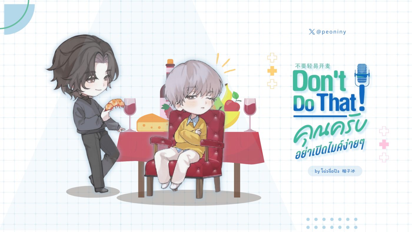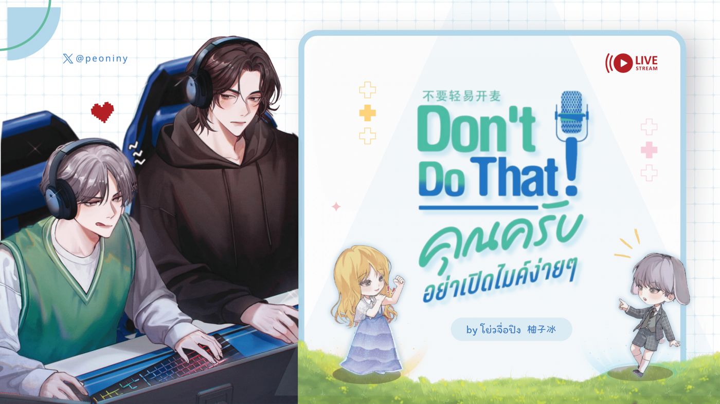สำหรับ Don't do that! คุณครับอย่าเปิดไมค์ง่ายๆ《不要轻易开麦》เป็นนิยายแนวรอมคอม ฟีลกู๊ดที่มีวงการอีสปอร์ตและวงการบันเทิงเป็นฉากหลัง เรื่องราวของ หลินเหว่ย หนุ่มน้อยสตรีมเมอร์ขวัญใจเหล่าคุณพ่อและมัมหมีที่สตรีมอยู่ดีๆก็ตกแฟนคลับสายเปย์อย่าง ช่างประปาแมรี่ เข้าด้อมมาได้แบบงงๆ แมรี่คนนี้นอกจากจะเปิดตัวด้วยการทุ่มเปย์อย่างเอิกเกริกแล้ว ฝีมือการเล่นเกมของเขาก็ทำให้ด้อมนกตื่นตะลึงกับความกากจนเอ็นดูกันยกใหญ่ 555 แม้แมรี่จะไม่เคยเปิดไมค์สักครั้ง แต่บอกเลยว่าแค่เปิดครั้งแรกด่าคนก็ตราตรึงใจสุดๆ แถมเสียงยังคล้ายกับดาราหนุ่มสุดหล่ออย่าง ลู่เหยาจือ ที่คุณแม่ของหลินเหว่ยเป็นปลาบปลื้ม ส่วนคุณสตรีมเมอร์แซ่หลินเองก็ชื่นชอบ (หน้าตา) ของดาราคนนี้มากอีกด้วย แหม เสียงคล้ายกันขนาดนี้จะเป็นคนละคนกันได้ยังไงใช่ไหมคะ? อิอิ (*ノωノ)