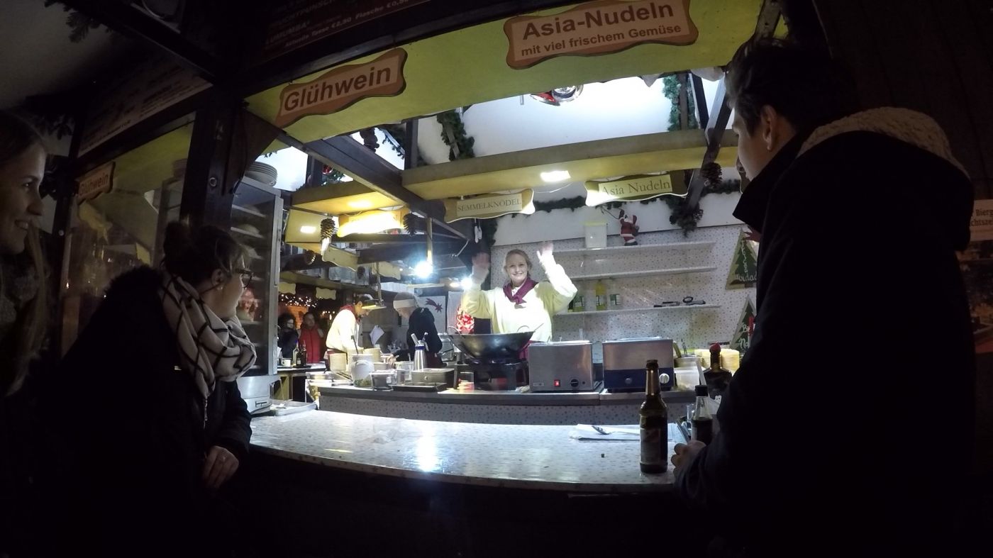 ที่ตลาดคริสต์มาสเมือง heidelberg ซึ่งเป็นเมืองที่มีมหาวิทยาลัยอยู่ใกล้กับเขตเมืองเก่า ทำให้มีนักศึกษามากมายทั้งเยอรมันและต่างชาติ น่าจะเป็นเพราะเหตุนี้จึงทำให้มีการออกร้านขายของของเด็กนักศึกษา เราไปเจอเมนูเอเชียนั่นก็คือ Asia Nudeln แปลตรงตัวว่า ก๋วยเตี๋ยวเอเชีย (ไม่มีการระบุอะไรทั้งสิ้น กว้างมาก 55) จะลองสั่งมากินดู ปรากฏว่าต้องรอผัดกระทะใหม่ จึงได้ดูฝรั่งผัดหมี่ สรุปว่าเป็นคล้ายๆหมี่ซั่ว เส้นกลมๆผัดเค็มๆแล้วก็มีผักกะหล่ำเส้นๆ อร่อยดีนะ