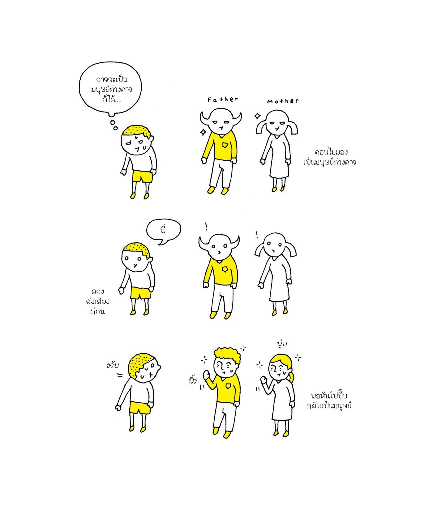 ตอนเรียนชั้นประถม ผมเคยคิดอย่างนี้แบบจริงจัง เข้าใจว่าเมื่อพ่อกับแม่คลาดสายตาจากเราไป พวกท่านก็จะกลายร่างเป็นมนุษย์ต่างดาว ตอนนั้นผมกลัวขึ้นสมองว่าจะหันไปเห็นพ่อกับแม่ในร่างเอเลี่ยน ทำให้ทุกครั้งเวลาจะหันไปหาพ่อกับแม่ ผมจะส่งเสียง “นี่”ก่อนทุกครั้ง