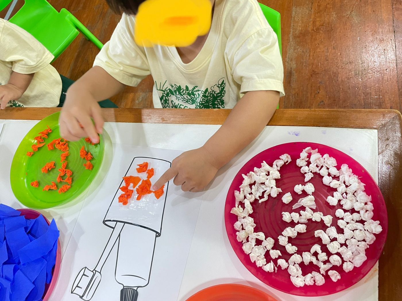 มีกิจกรรมกลางแจ้งให้เด็กๆช่วยกันทำภารกิจโดยมีขั้นตอนในการเล่นคือ ให้เด็สะพายกระเป๋าเดินไปหยิบ นม,ช้อนส้อม ใส่กระเป๋าแล้วไปปั่นจักรยาน เพื่อให้จำลองสถานการณ์การมาโรงเรียน และมีการเสริมประสบการณ์การท่อง และมีกิจกรรมขยำกระดาษแล้วนำมาติดที่ภาพแปรงฟัน,แก้วน้ำ,ยาสีฟัน