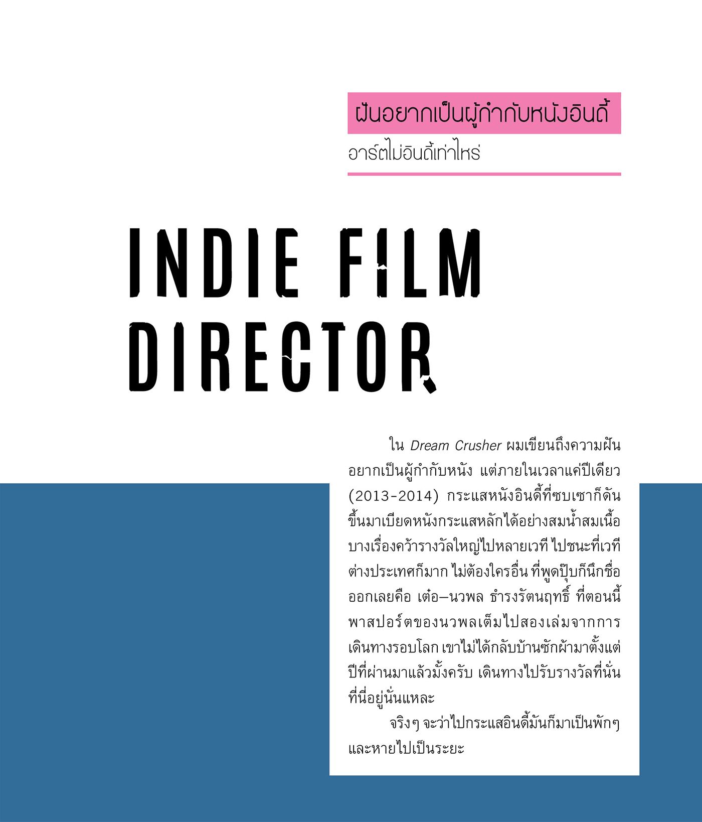 การทำหนังอินดี้ไม่ใช่เรื่องเล่นๆ ไม่ใช่เรื่องความเท่ ผู้กำกับหนังอินดี้ที่เรามองว่าเท่ คือคนที่ทำไข่ดาวไม่สุกมาแล้วเป็นร้อยๆ ฟอง ทำจนรู้ว่าคนกินชอบแบบไหน ไม่ชอบแบบไหน