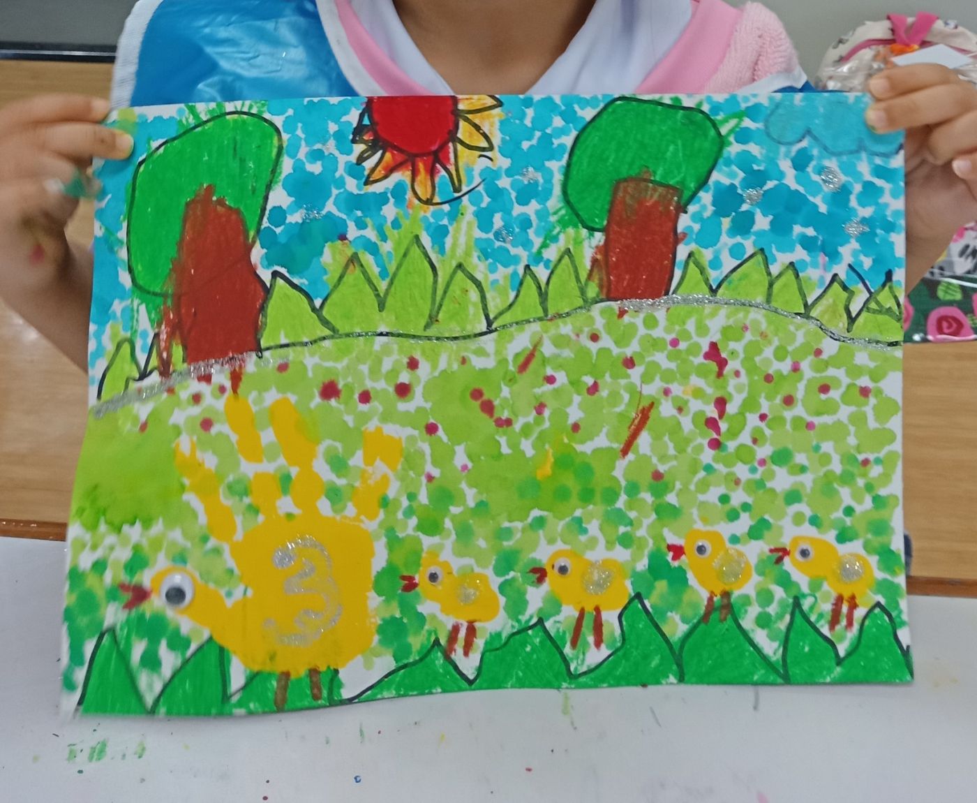 ส่วนน้องที่ทำงานนี้ไปแล้วก็มีงานใหม่ นั่นก็คือ "แม่ไก่&เดอะแก๊งลูกเจี๊ยบ" น้องจะใช้สีชอล์กระบายก่อน จากนั้นก็พิมพ์มือเป็นแม่ไก่แล้วก็ใช้นิ้วโป้งพิมพ์เป็นลูกเจี๊ยบ จากนั้นก็จุดสีต่อ แรก ๆ ก็ตั้งใจทำกันดีเลย แต่พอเริ่มจุดสีเท่านั้นแหละ เริ่มไม่อยากทำกันแล้ว น้องเริ่มวอกแวก เราก็เลยช่วยน้องทำไปด้วย