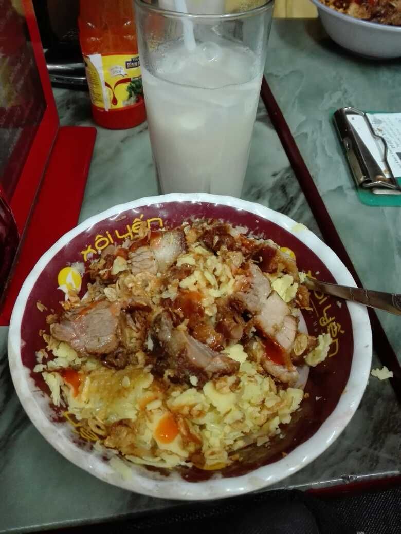 แมคจึงพาไปอาหารร้านเด็ดดวง นั่นก็คือ ร้าน Xôi Yến ข้าวเหนียวนึ่งสีเหลืองอร่ามตา โป๊ะด้วยมันบดต้ม แล้วก็เลือกหน้า เป็นหมูทอดมา ส่วนน้ำนั้นคือน้ำข้าวโพด ในราคาน่ารัก อร่อยอยู่นะ