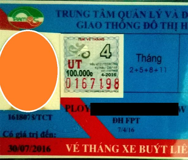 การเดินทางไปเราจะใช้บัตรรถเมล์ที่ต้องซื้อทุกเดือน บัตรก็น่ารักมาก ติดรูปหน้าเราด้วย โครตเกลียดหน้าตัวเอง 55555 ราคาอยู่ที่ 100,000 VND ต่อเดือน ประมาณ 130 บาท