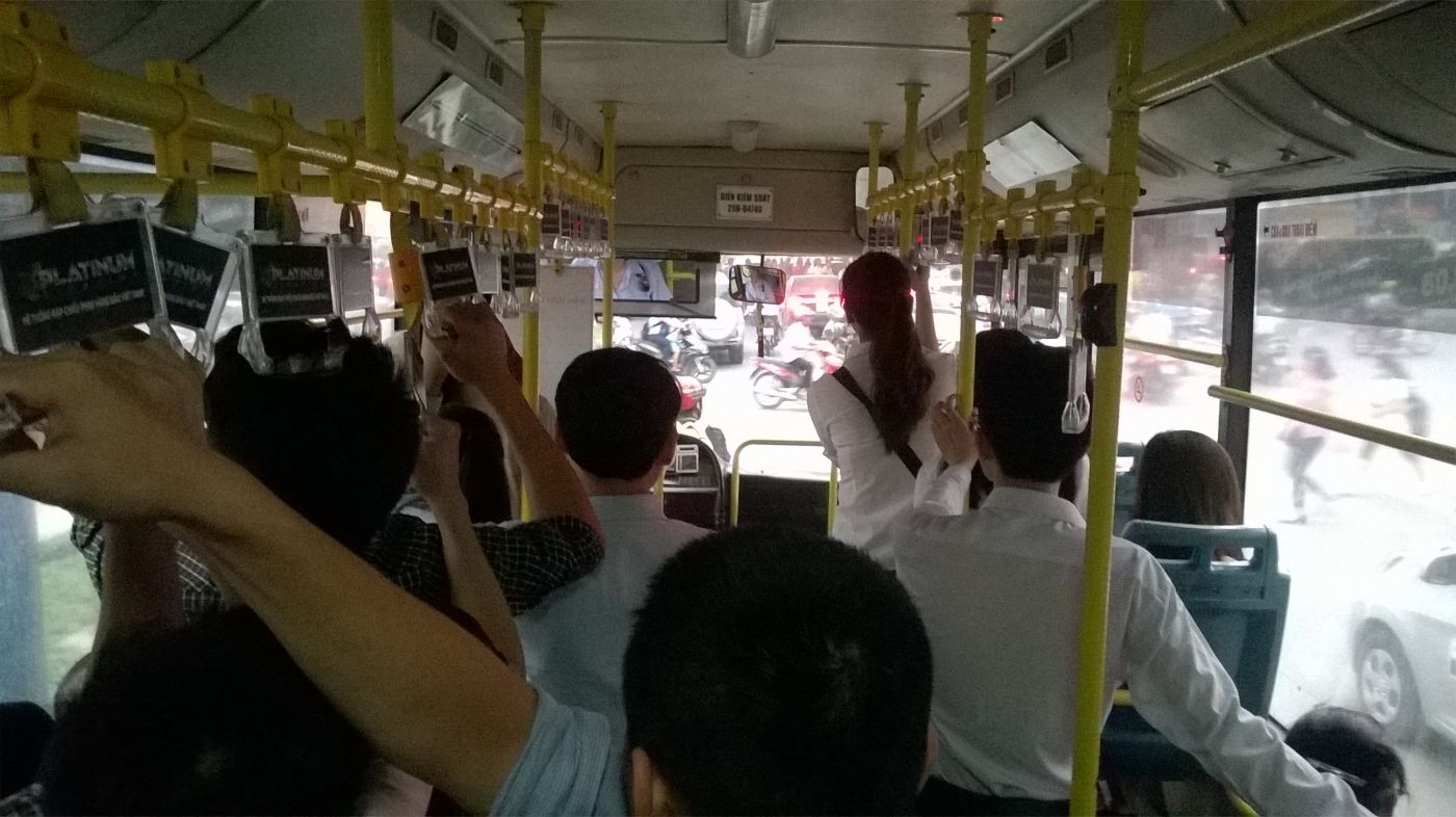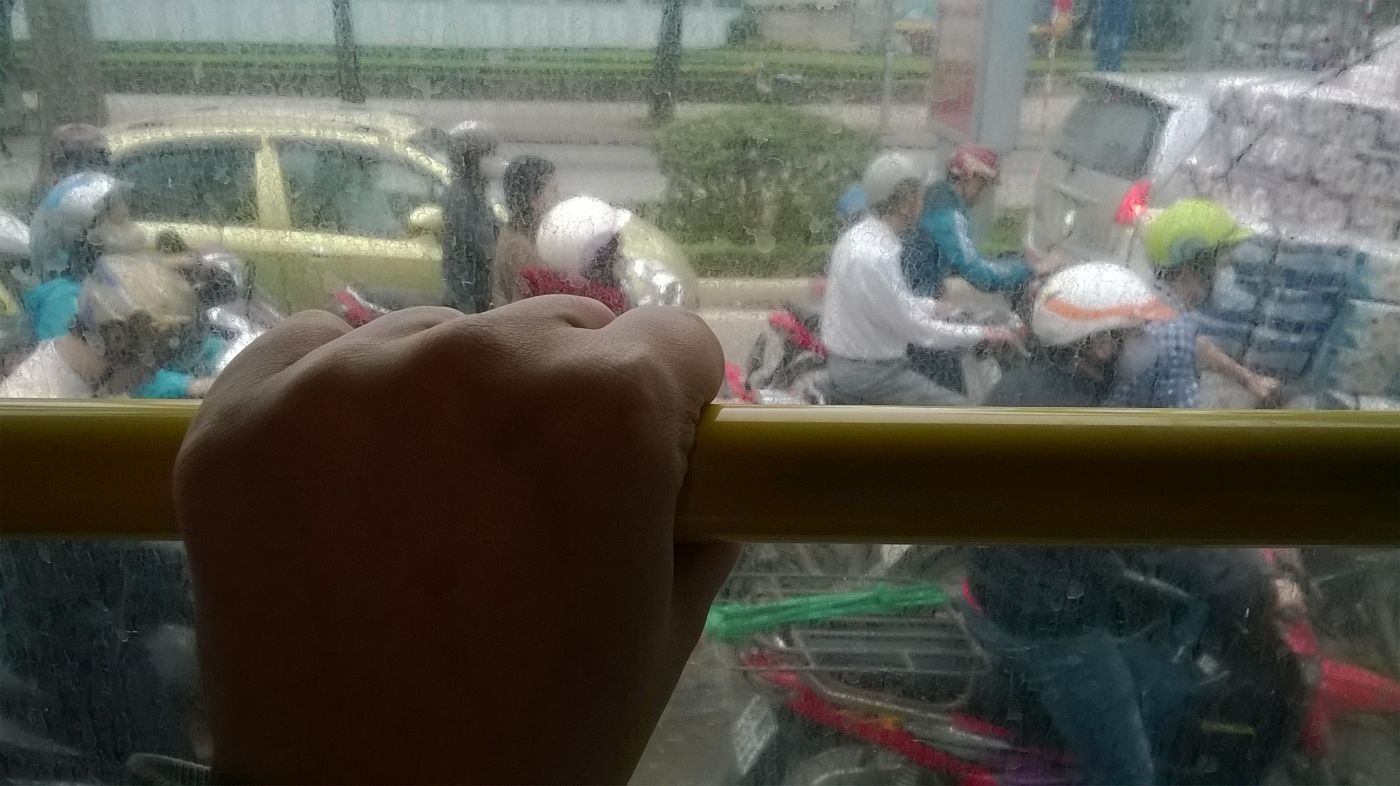 ภาพนี้คือรถเมล์ที่เราเกาะไปทำงานทุกวัน บางก็เดินนะ ภาพด้านนอกคือวุ่นวายมาก เสียงบีบแตร รถจักรยานยนต์ที่เต็มไปหมด อะโห่ วุ่นวายสุดๆ แต่สักพักก็อยู่ด้วยความชิน