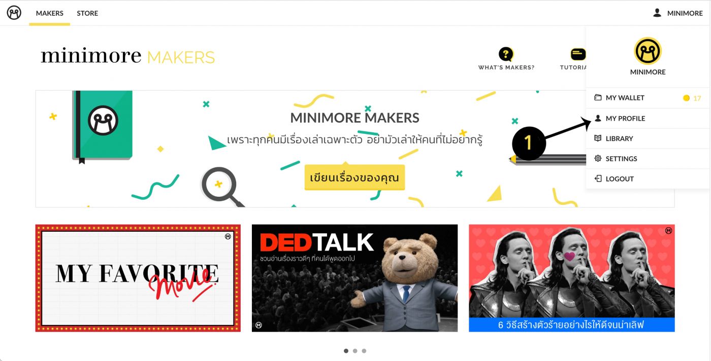 1. ถ้าต้องการเริ่มใช้งาน คลิกไปที่ชื่อล็อกอินมุมขวาบนของหน้า > เลือก MY PROFILE