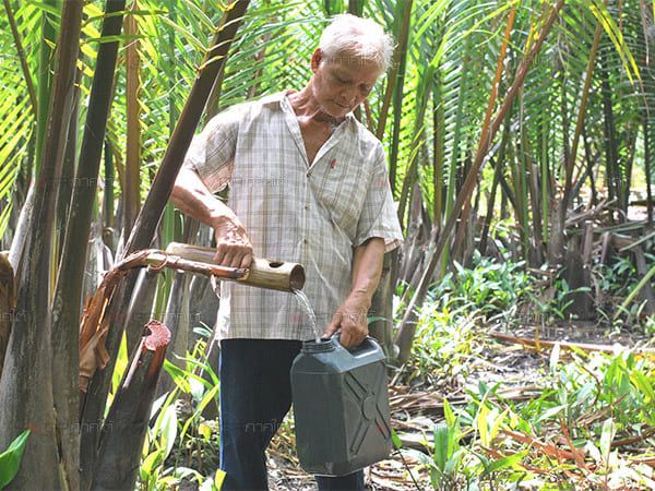 ลุงเก็บ "น้ำตาลจาก" จากงวงที่สุกได้ที่